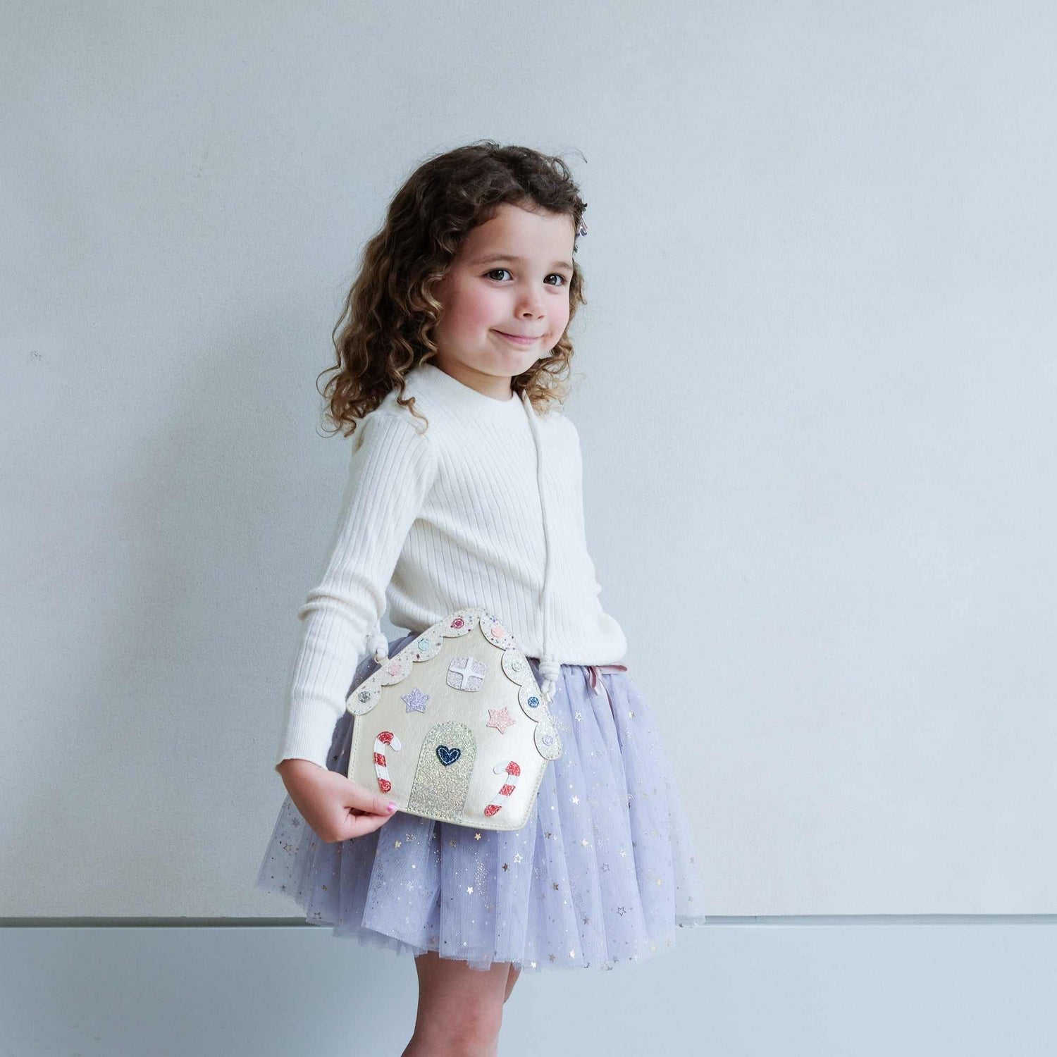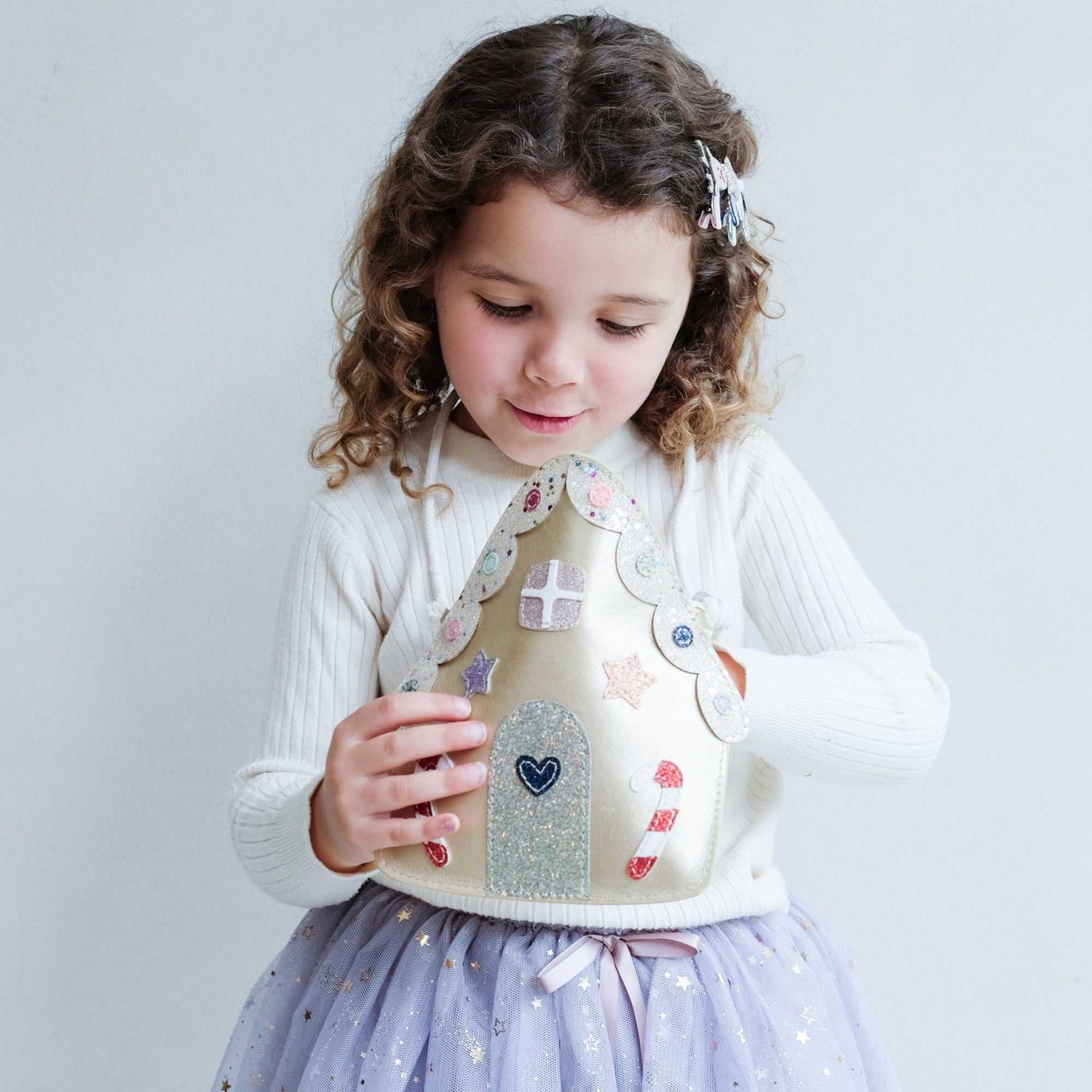 Eine bezaubernde Tasche von Mimi & Lula in Form eines Lebkuchenhauses. Verziert mit Zuckerstangen, glitzernden Sternen und einem
