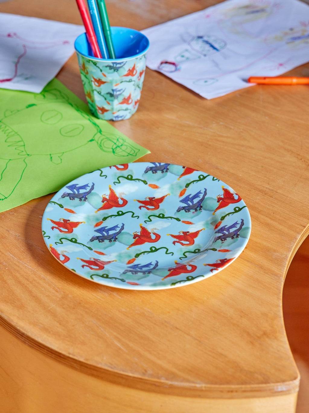 Der klassische runde Kinder-Melaminteller von Rice mit feuerspeienden Drachen.