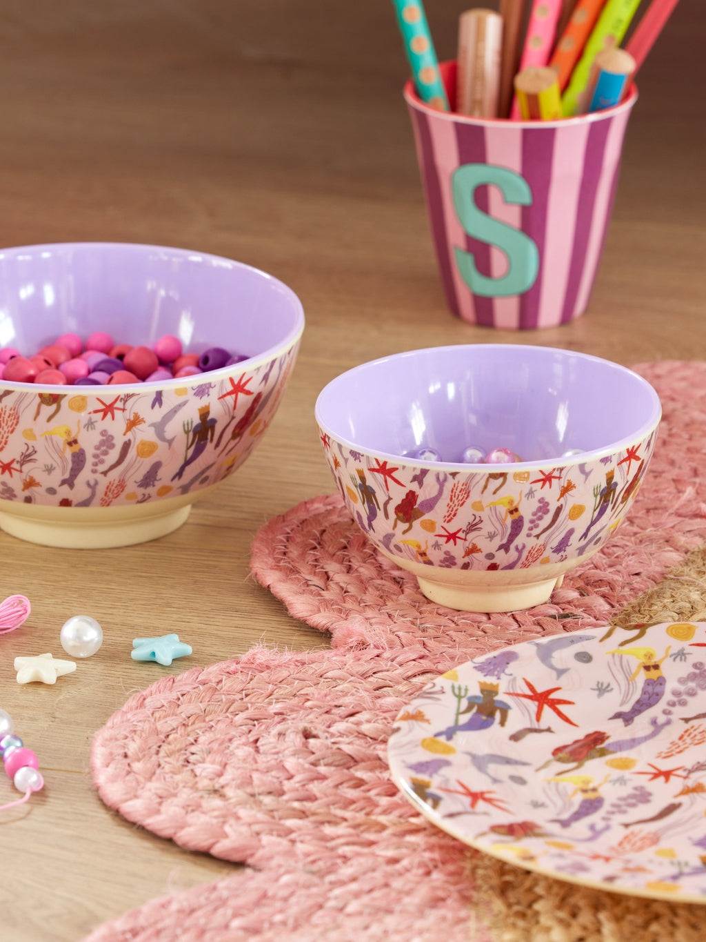 Der klassische runde Kinder-Melaminteller von Rice mit coolen Meerjungfrauen und ihren Freunden aus dem Meer.