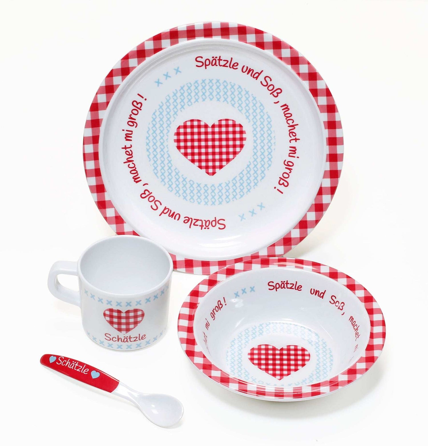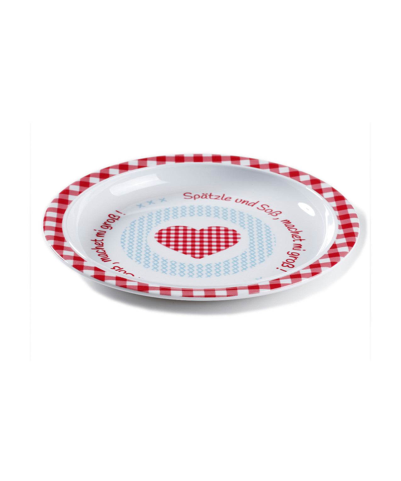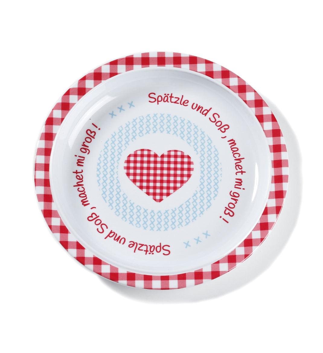 Melaminteller- Spätzle und Soß, machet mi groß! Melaminteller mit dem das Essen lernen leichter geht. Der Rand des Tellers ist in rotem Karo bedruckt, im Inneren des Tellers sind der Schriftzug und ein Herz abgebildet.