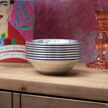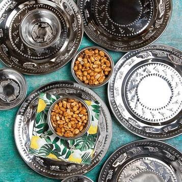Diese tolle silberne Schüssel von Talking Tables im Boho- Style eignet sich perfekt für ein Grillfest oder eine Gartenparty im Sommer. Das Muster wird in Indien handgefertigt und wird ihre Gäste begeistern. Die wiederverwendbare Schüssel ist einfach zu transportieren und abzuwaschen. Sie können darin herzhafte oder süße Leckereien Servieren.