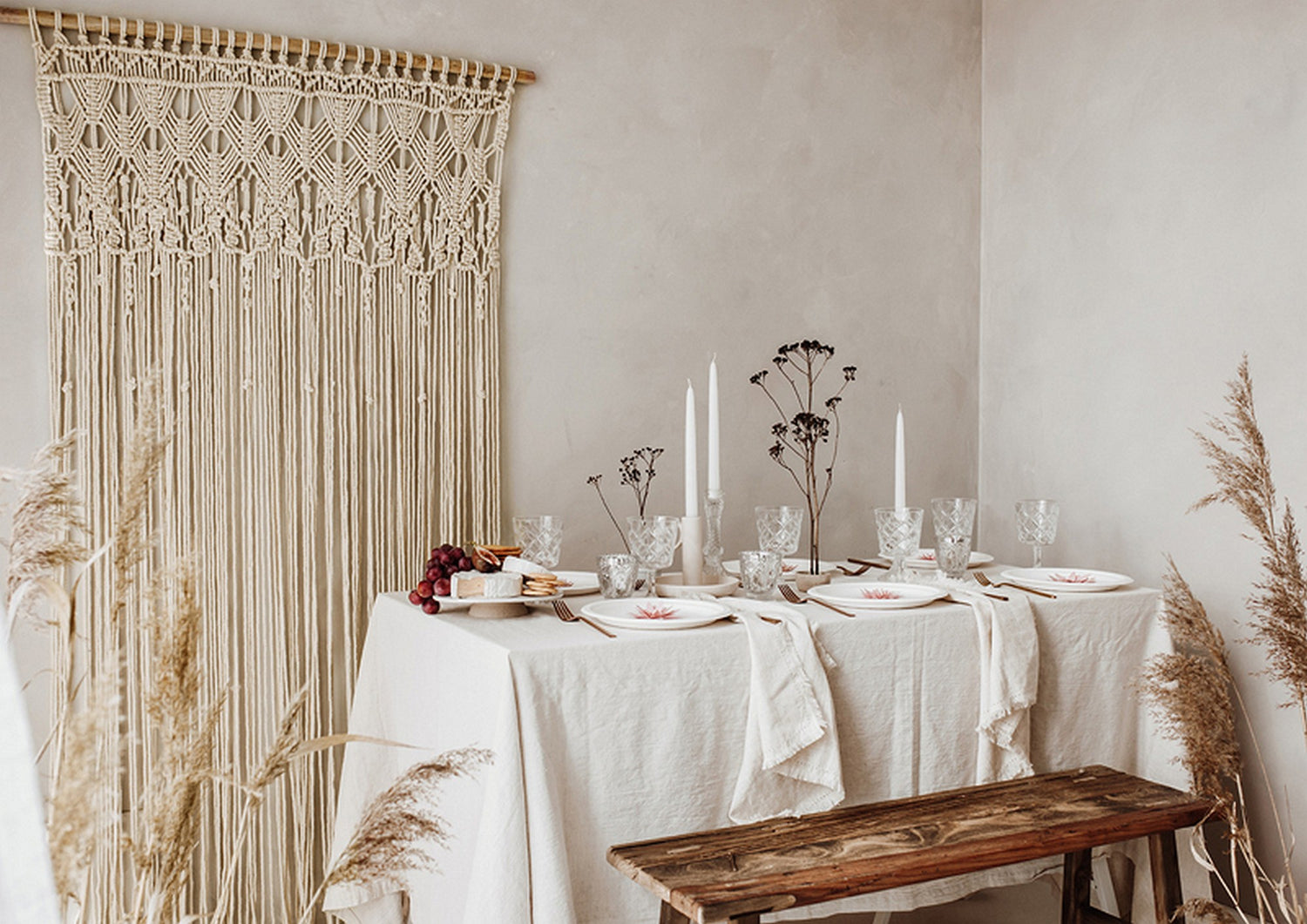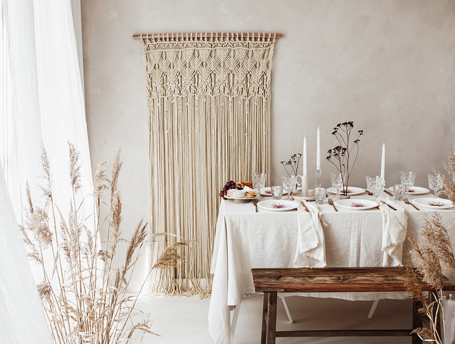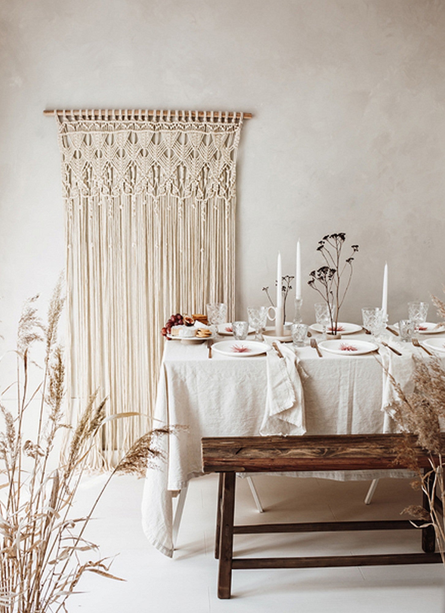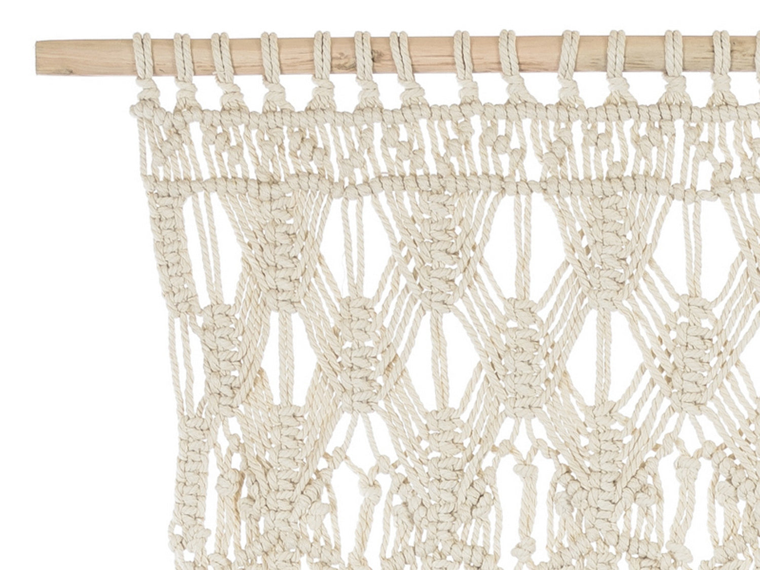 Dieser handgefertigte Makramee-Behang aus fein gewebten Materialien in cremefarbener Farbe hat Dimensionen und Texturen, die jeden Raum gemütlich wirken lassen.