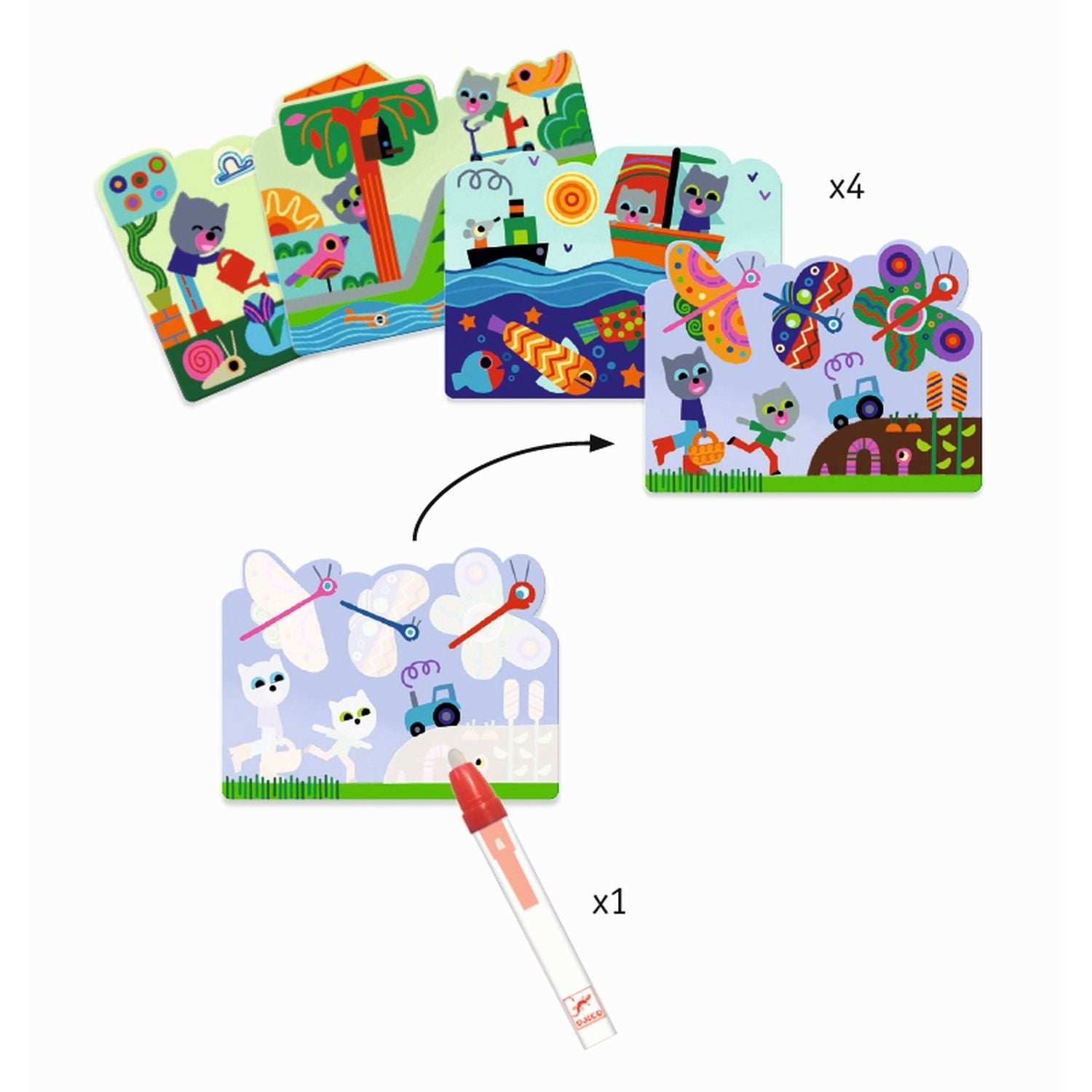 Eine Aquarellpackung, die für Kinder ab 18 Monaten geeignet ist. Das Kind malt die weißen Teile mit dem Wasserstift an, um zu entdecken, was sich im Himmel verbirgt. Es ist magisch: Muster erscheinen und wechseln die Farben! Die Bretter trocknen und das Kind fängt wieder an!