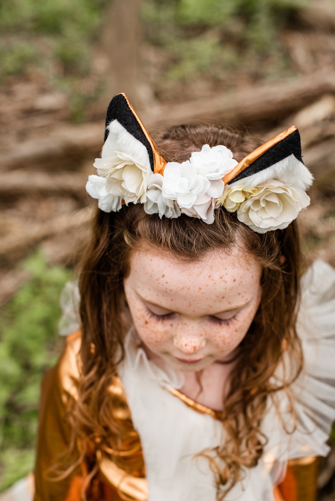 Der Rock ist gefüttert, sodass er nicht kratzt. Die weißen Tüllrüschen um den Ausschnitt und der Schwanz auf der Rückseite des Rockes verstärken den Fuchseffekt.