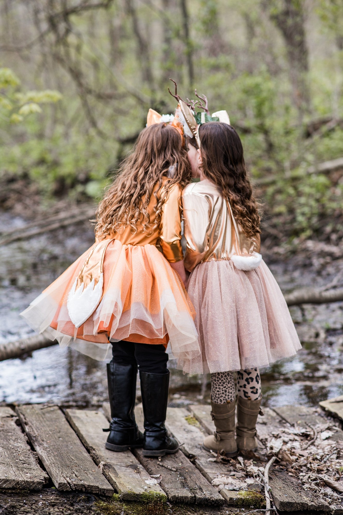 Dieses süße Fuchskostüm hat einen weiten Rock mit glitzernder Goldfolie (ohne Glitzer), einen Obre-Effekt auf den Tüllschichten, dreiviertel Ärmel und einen Kragen mit V-Ausschnitt.
