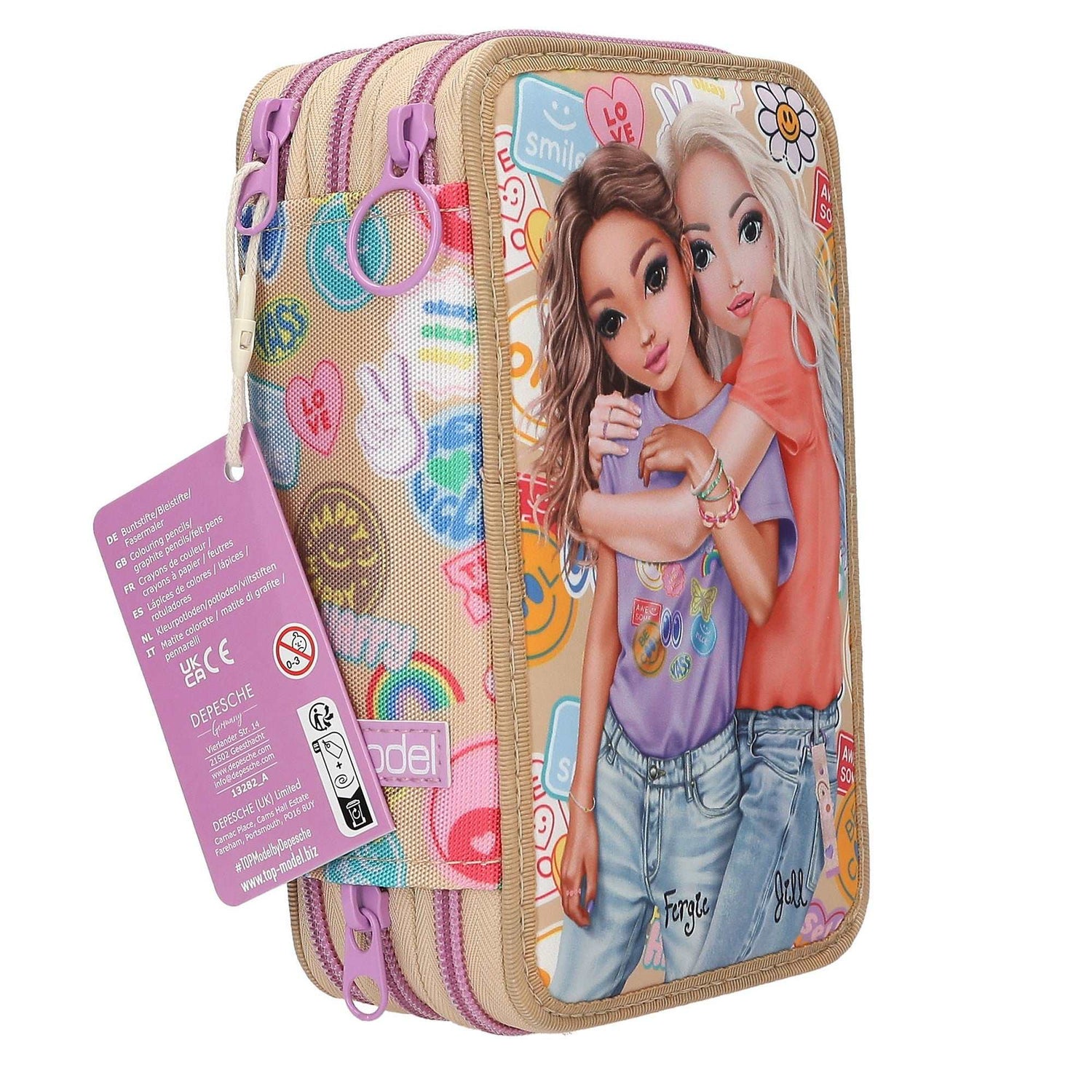 Die beigefarbene TOPModel-Federtasche hat auf der Front ein großes Doppel-Modelmotiv und rundherum jede Menge fröhlich-bunte Batch-Prints. Cooler Hingucker: die bunten Reißverschlüsse.