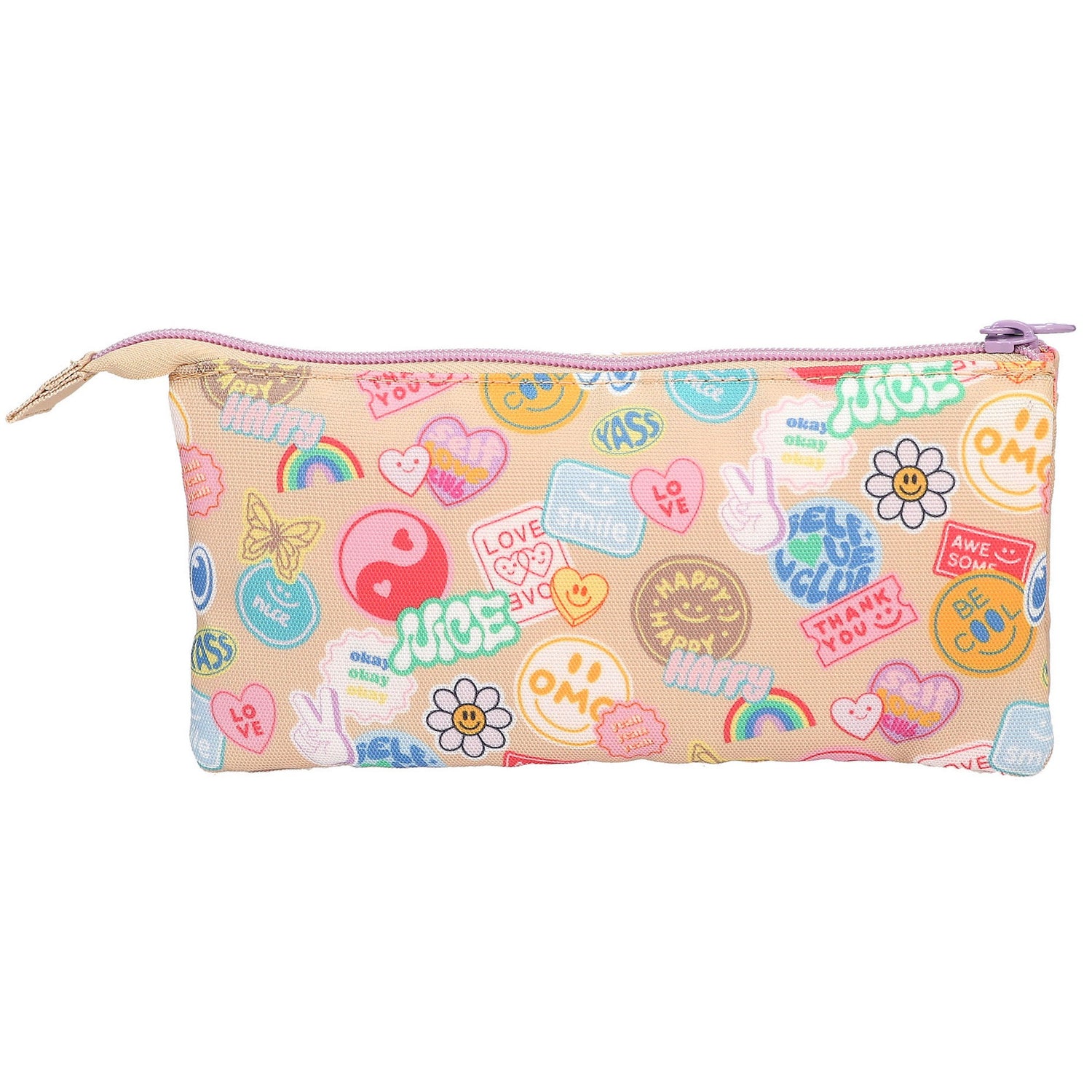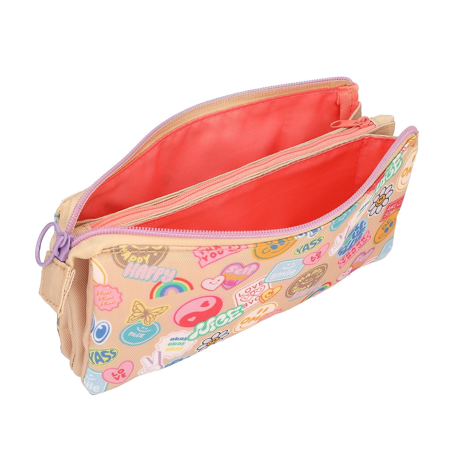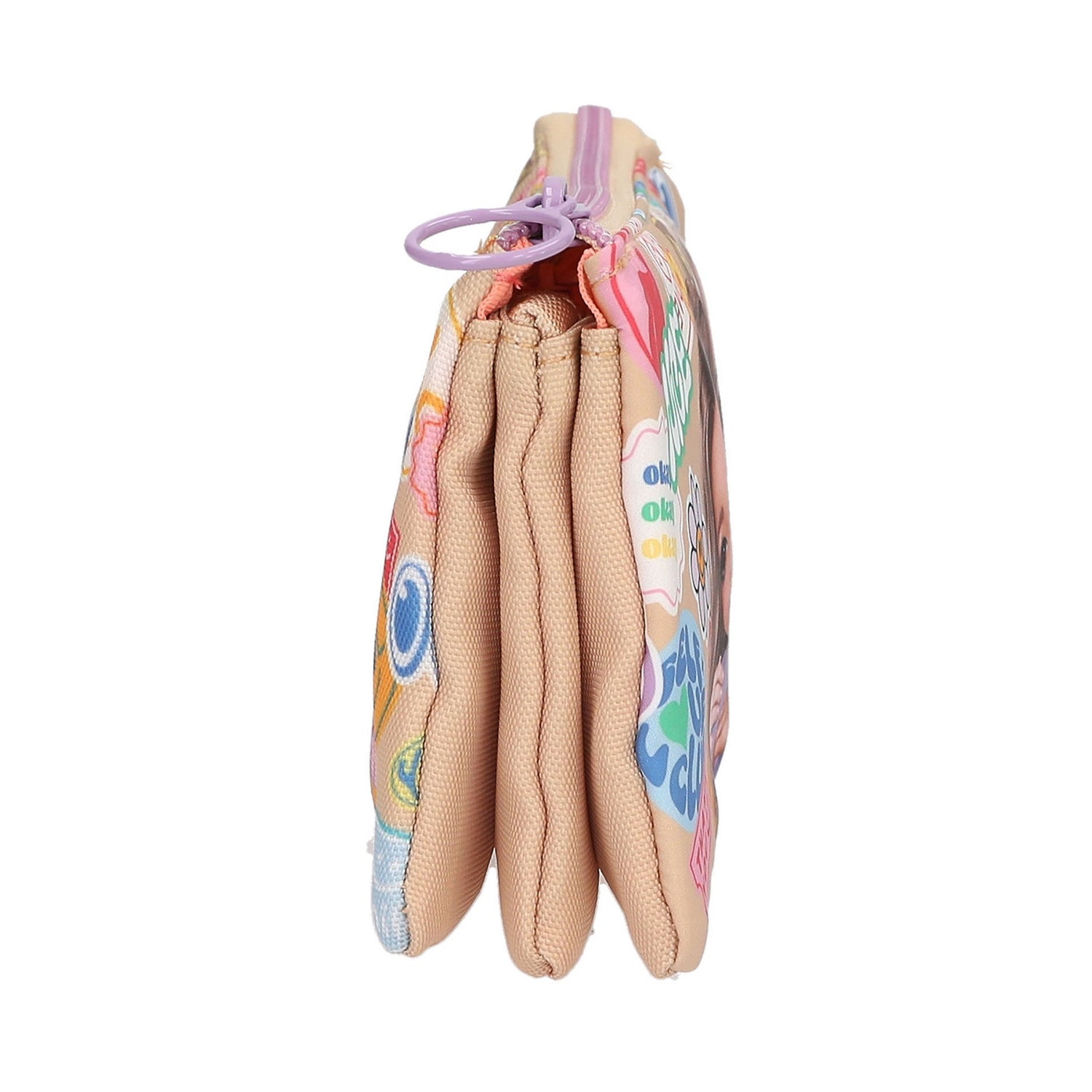 Die beigefarbene TOPModel - Schlampertasche hat auf der Front ein tolles Doppel-Modelmotiv und rundherum coole bunte Batch-Prints. Unter dem Hauptreißverschluss bieten drei Fächer Platz für Stifte & Co., eines davon mit zusätzlichem Reißverschluss. Die drei Fächer haben ein korallen farbenes Innenfutter, Material: 100 Prozent Polyester
