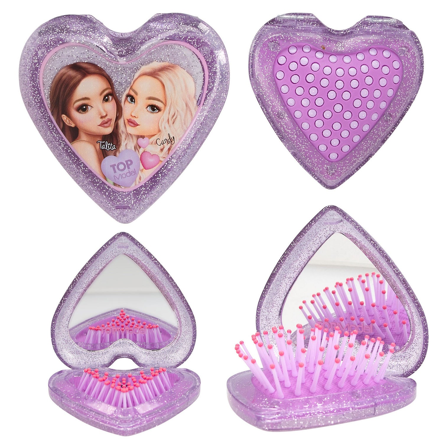 Die TOPModel-Klapphaarbürsten in handlicher Herzform gibt es in transparentem Rosa und Lila.
