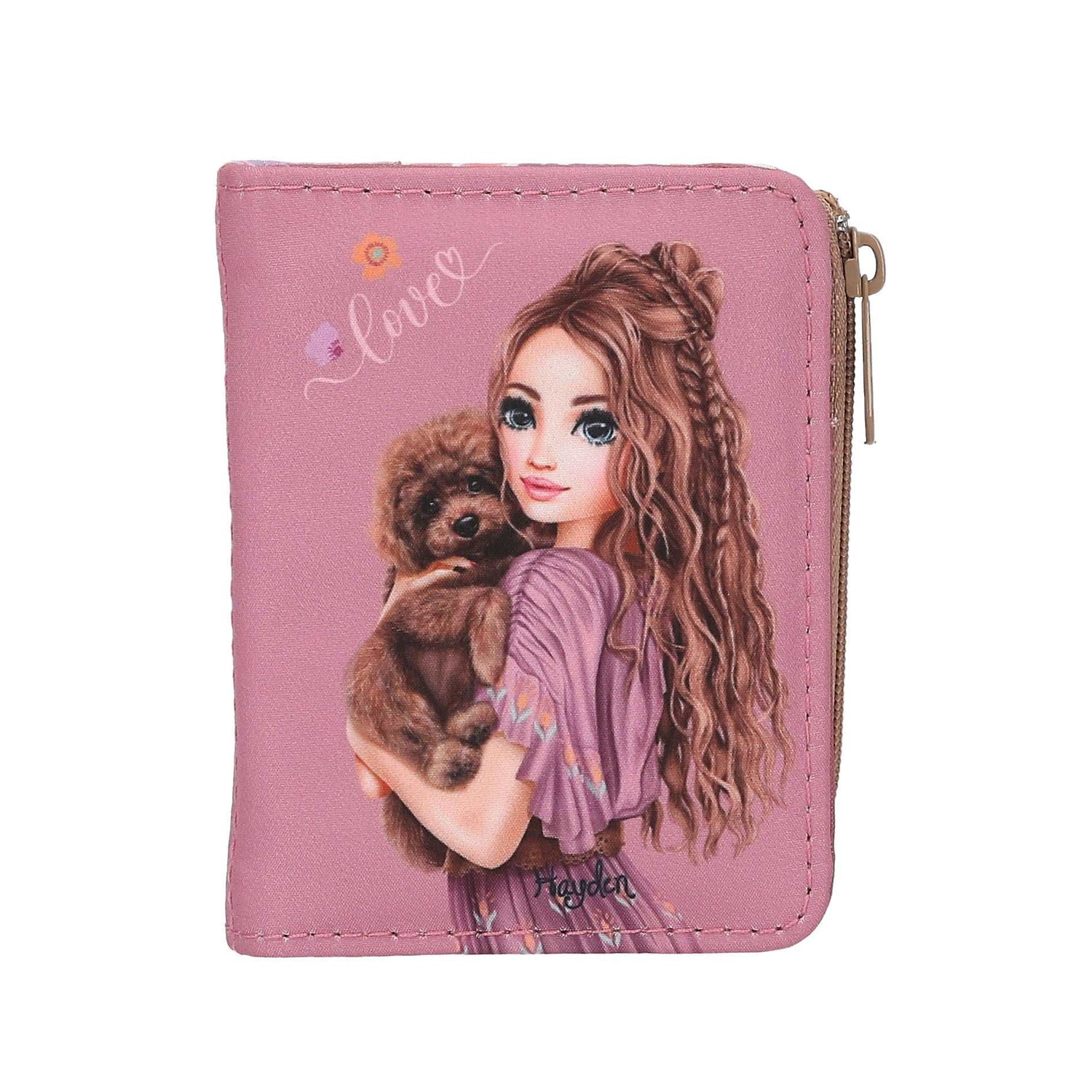 Fantastisch Floral: Das Portemonnaie aus der neuen TOPModel Serie hat auf der beeren farbenen Front ein stylishes Model-Motiv mit einem supersüßen Hund auf dem Arm.
