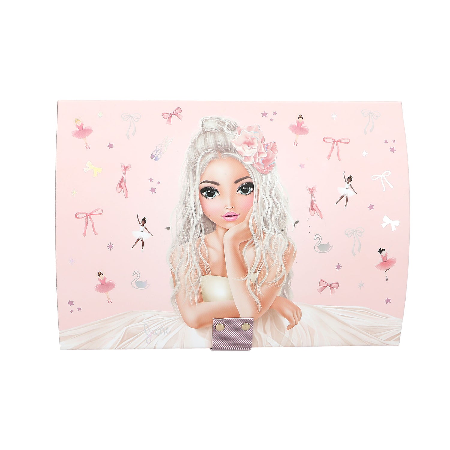 Das Design in sanftem Rosé mit Model-Ballerina-Motiven innen und außen sowie niedlichen Verzierungen wie Schleifchen, Sternchen, Schwänen und Tänzerinnen macht das Schmuckkästchen zu einem echten Blickfang.