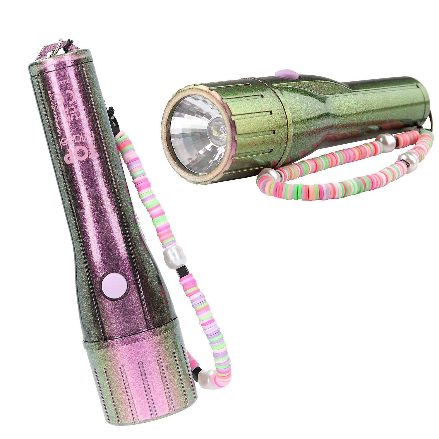 Mit Hingucker-Handschlaufen aus farblich passenden bunten Perlen. Praktisch: Die Taschenlampe hat eine Abschaltfunktion und schaltet sich nach 10 Minuten automatisch aus.