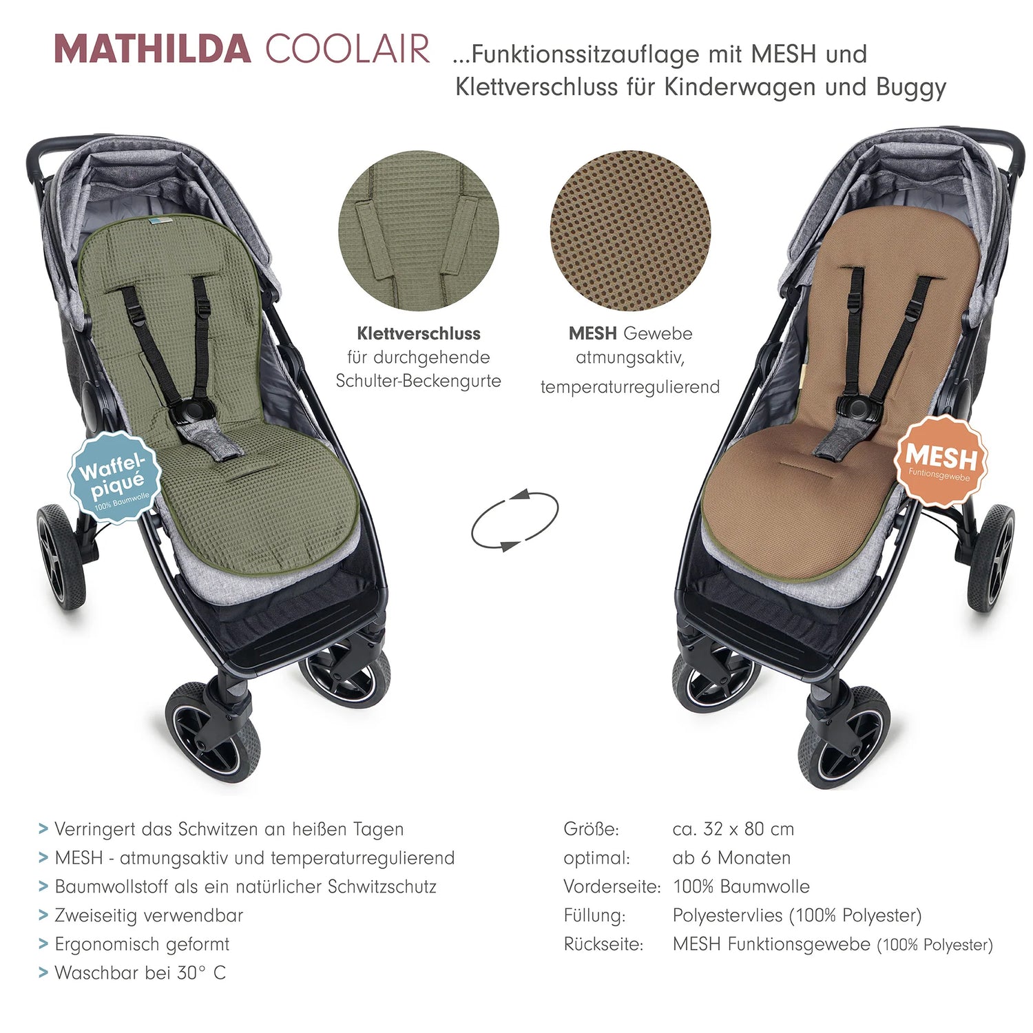 Die Mathilda Coolair von Priebes ist eine zweiseitige Funktionsauflage für Kinderwagen und Buggys mit Klettverschluss.