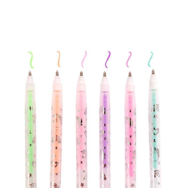 Die Stifte in den Farben Grün, Blau, Orange, Lila, Pink und Rosa sind mit einem effektvollen Einhorn-Print in Silber bedruckt.