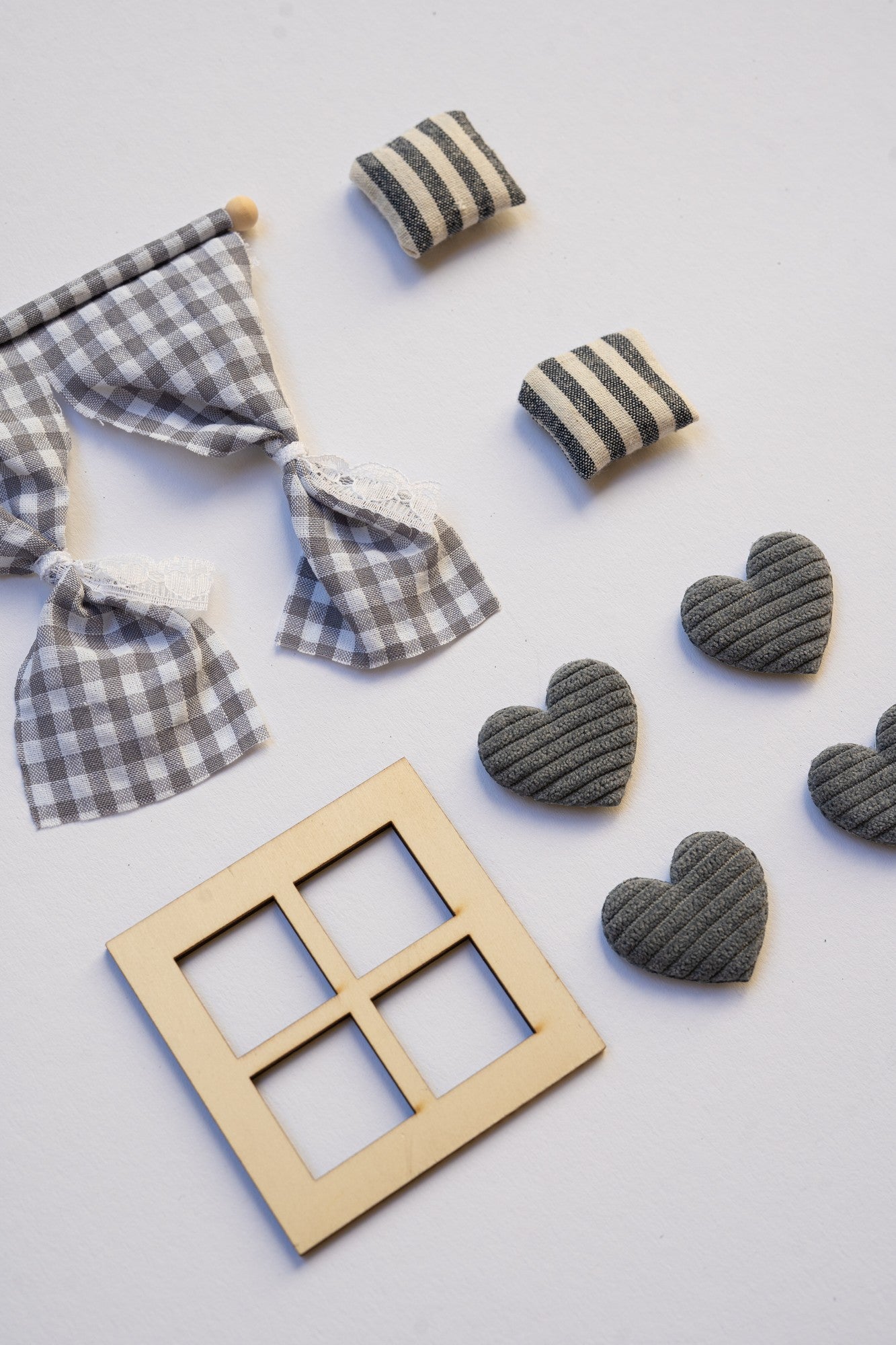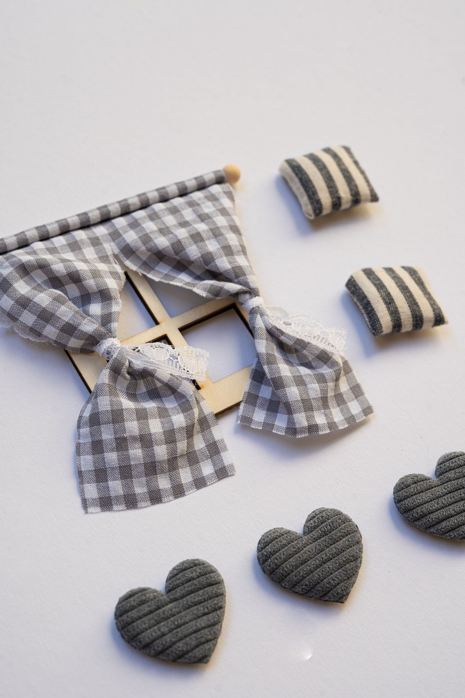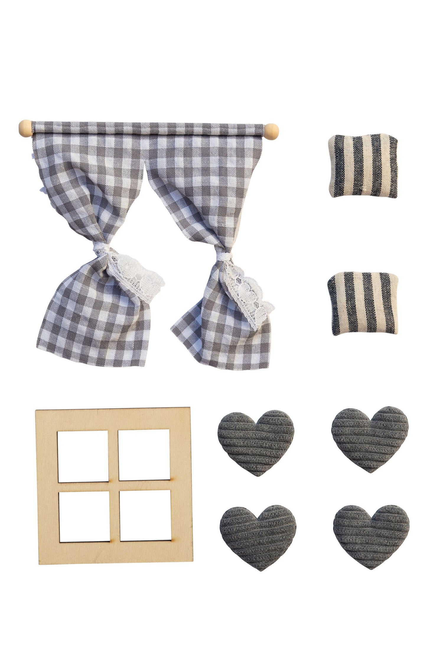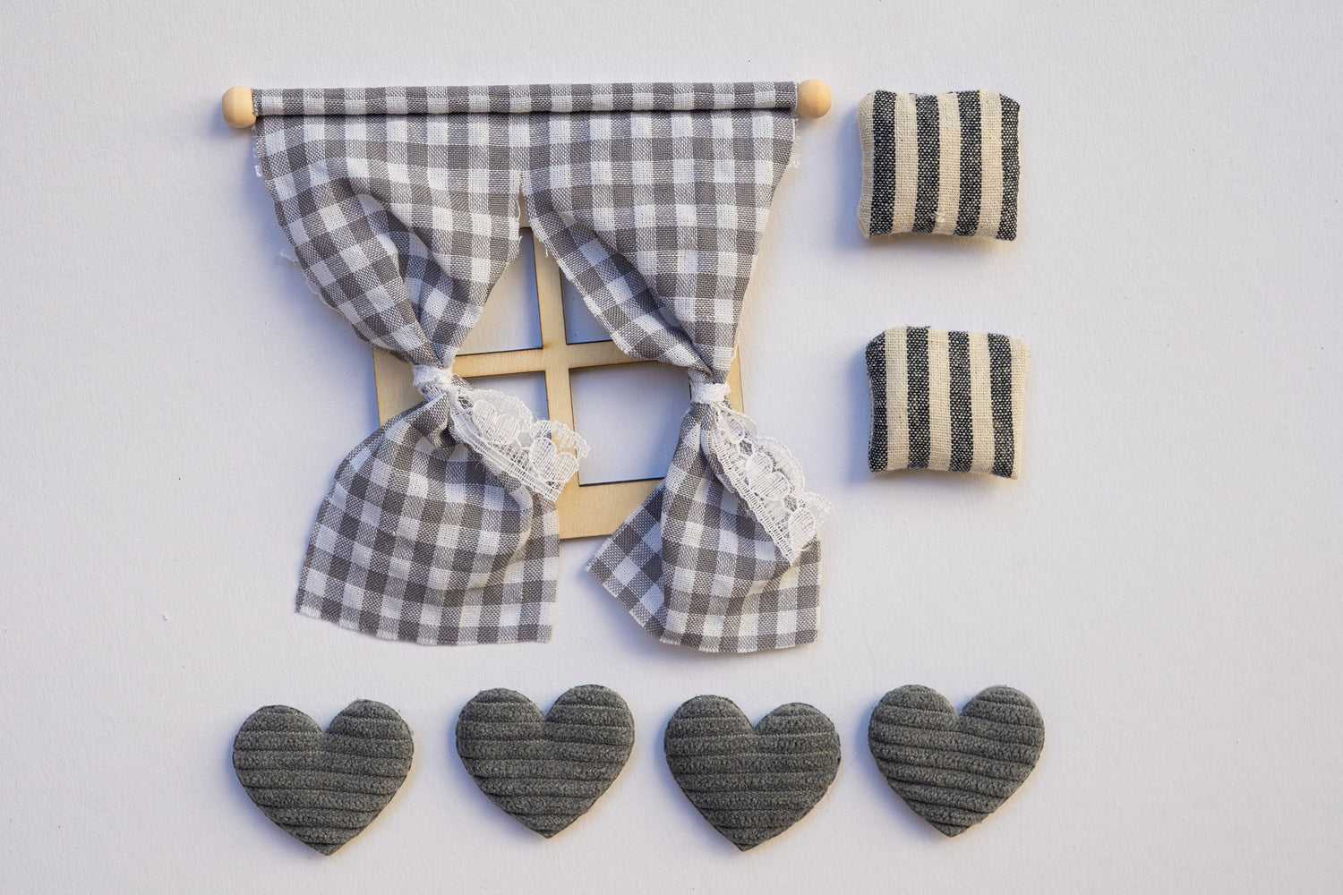 Das Set beinhaltet: 3 Fenster ca.7 x 7 cm/ Vorhang ca. 11,5 x 12 cm/ 2 Kissen 2,8 x 2,8 cm/ 4 Stoffsterne ca. 3,6 cm