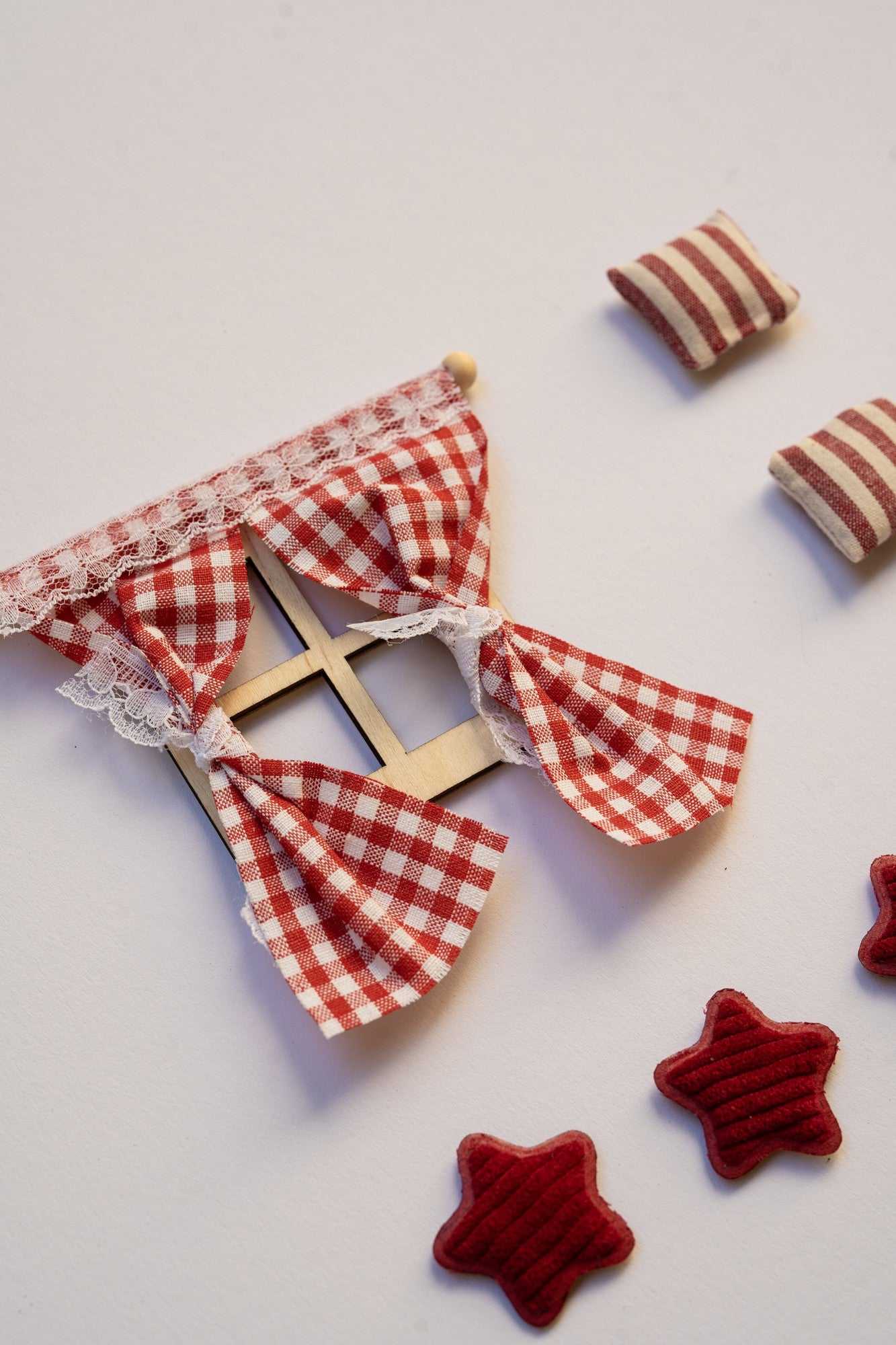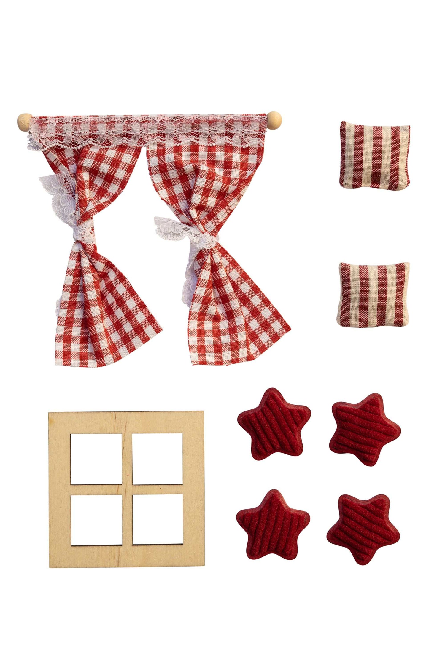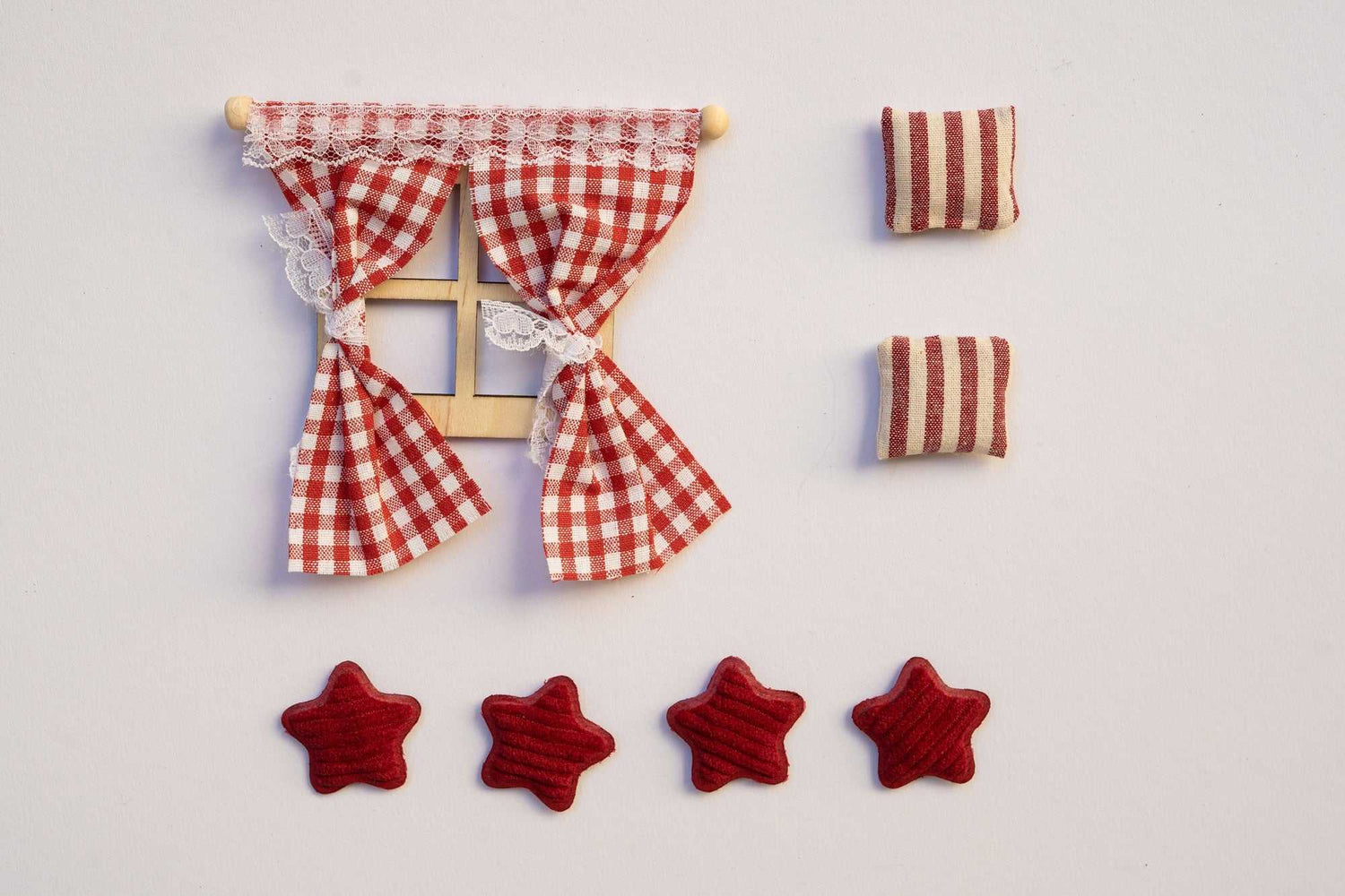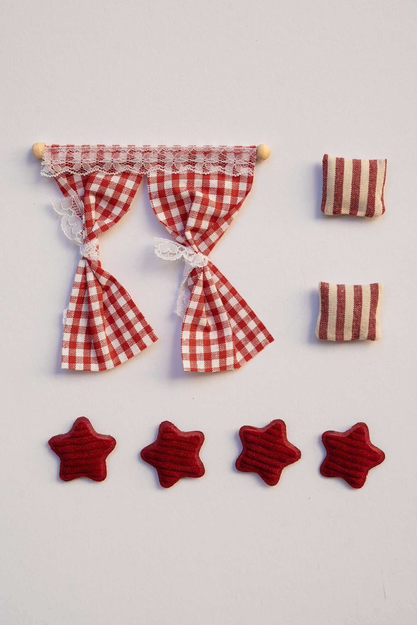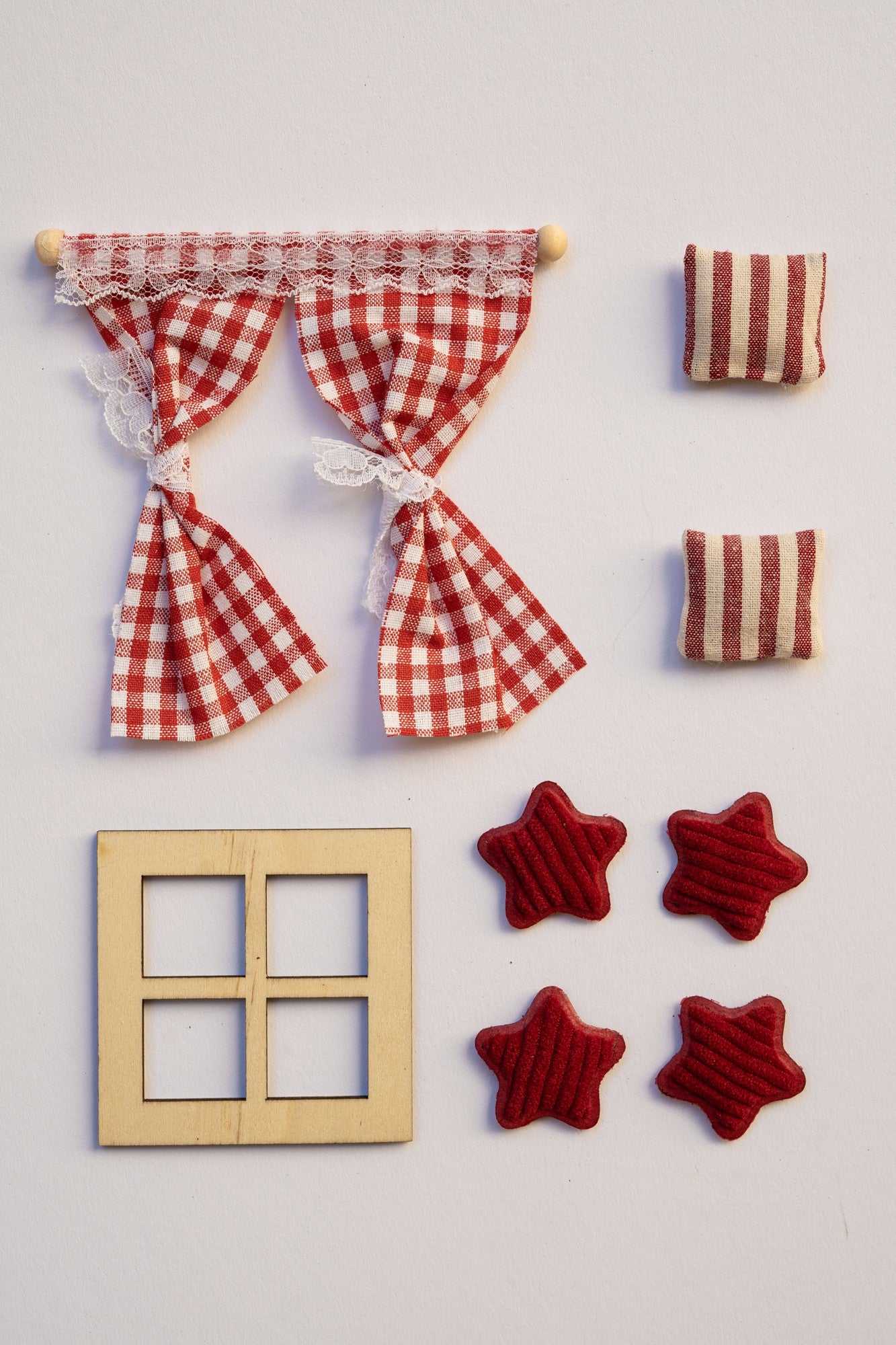 Das Set beinhaltet: 3 Fenster ca.7 x 7 cm/ Vorhang ca. 11,5 x 12 cm/ 2 Kissen 2,8 x 2,8 cm/ 4 Stoffsterne ca. 3,6 cm