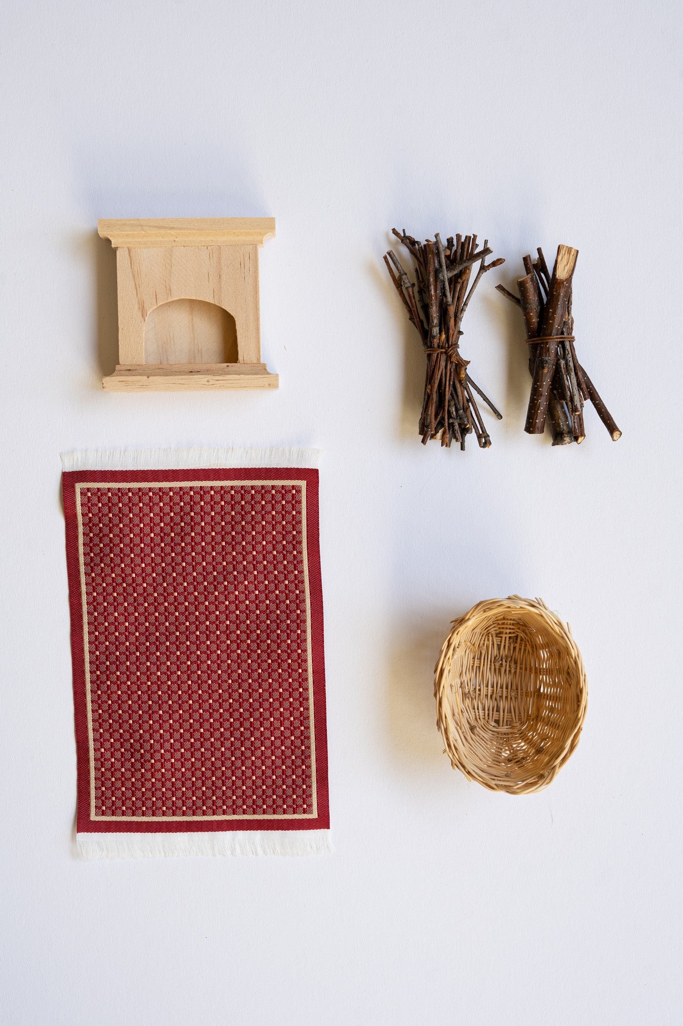 Das Set beinhaltet: Kamin ca. 6,5 x 6,7 x 2,2 cm/ Reisig Bündel 2 Stück ca. 7 cm/ Teppich ca. 10 x 15 cm/ Korb 7,5 x 5 x 3,5 cm