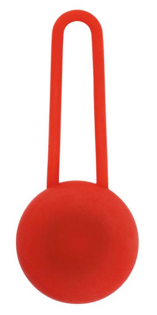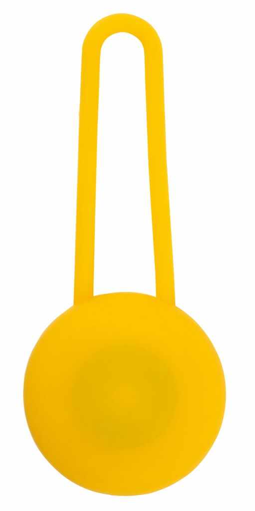 Der Anhänger ist in den leuchtenden Farben Blau, Gelb, Rot und Rosa erhältlich und lässt sich unkompliziert mit der Schlaufe befestigen.