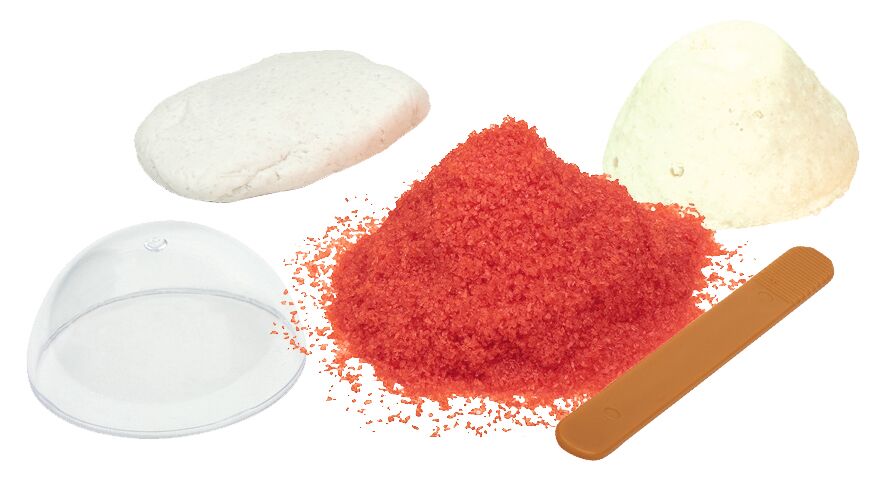 - Inhalt: Kristallpulver, Rührstäbchen, Anleitung, Anzuchtkegel (blaue und nachtleuchtende Kristalle) bzw. Knetmasse und Kunststoffschälchen (rote Kristalle)