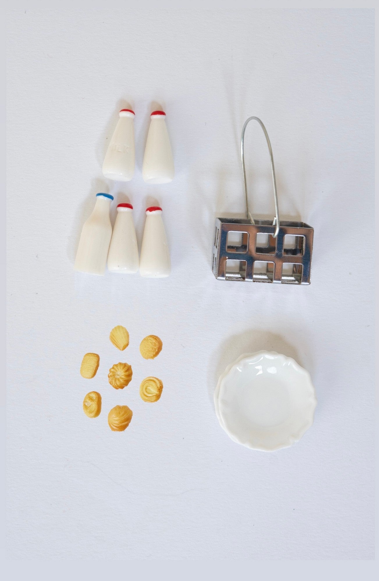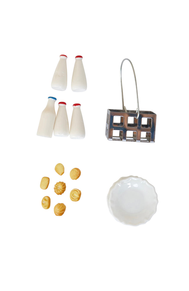 Im Set enthalten sind: ein Flaschenkorb, fünf Milchflaschen, eine Schüssel, sieben Kekse
