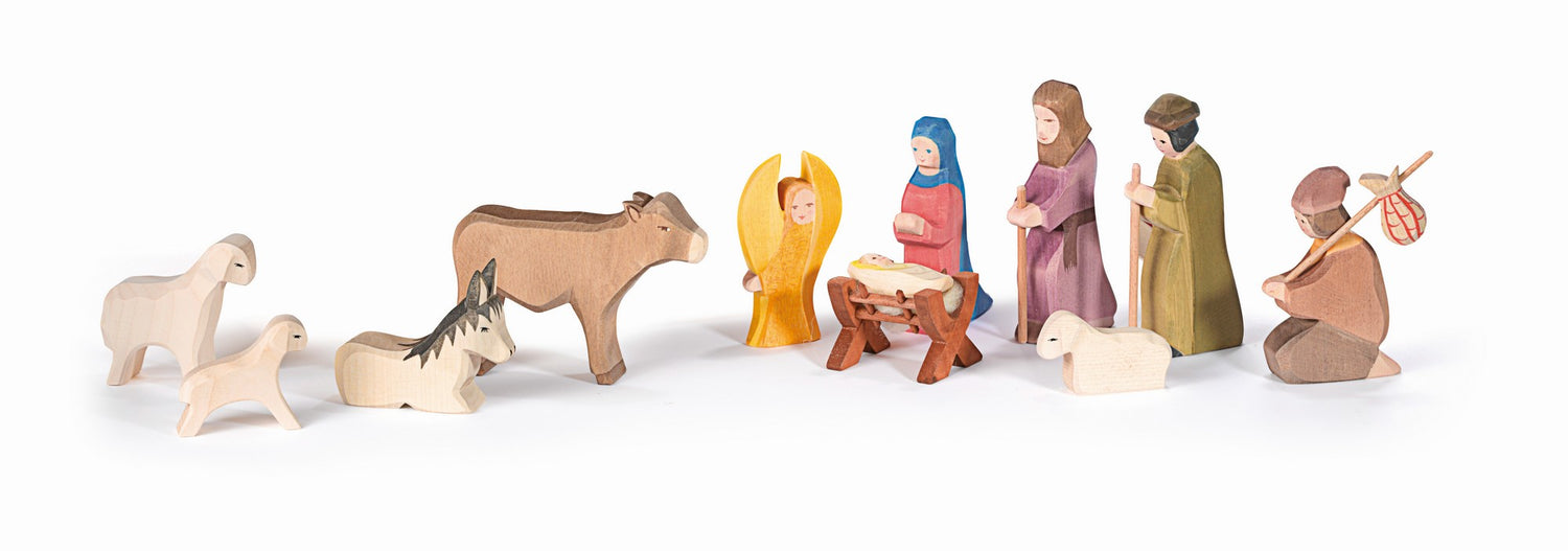 Die wundervolle Geschichte von der heiligen Familie, den Hirten und den Tieren im Stall wird mit dieser wunderschönen 13- teiligen Krippe von Ostheimer zum Leben erweckt.