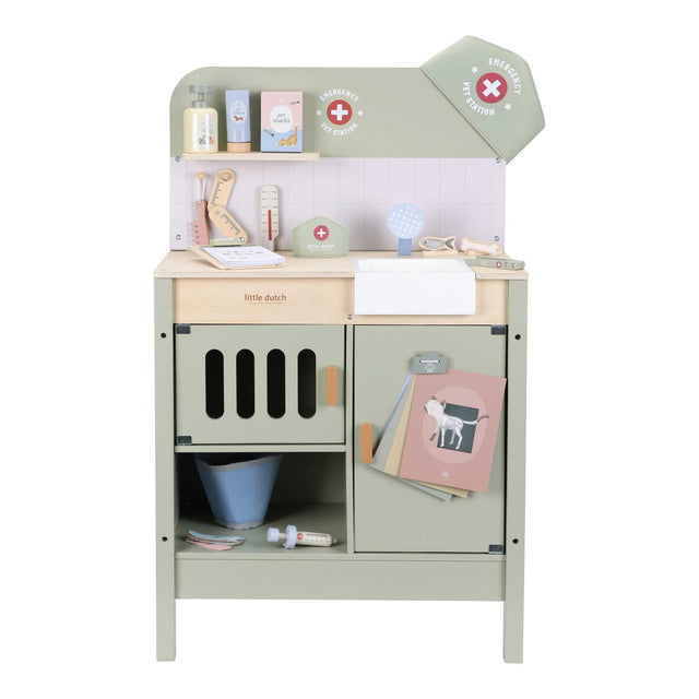 Umfassende Spielstation für kleine Tierfreunde von Little Dutch. Die hölzerne Tierarztpraxis bietet alles, was für die Pflege von Kuscheltieren und Spielzeugtieren benötigt wird: integriertes Waschbecken mit ausziehbarem Duschkopf, Kamm, Thermometer, Spritze und Pflaster. Ergänzt wird das Set durch ein Stoffstirnband und einen Clip zum Aufhängen medizinischer Illustrationen und Röntgenbilder.