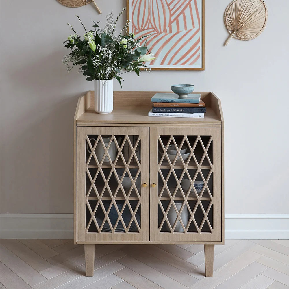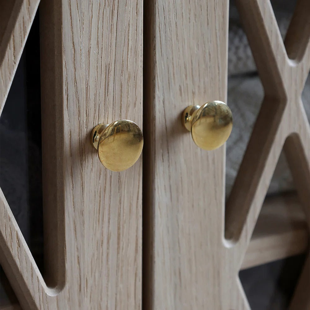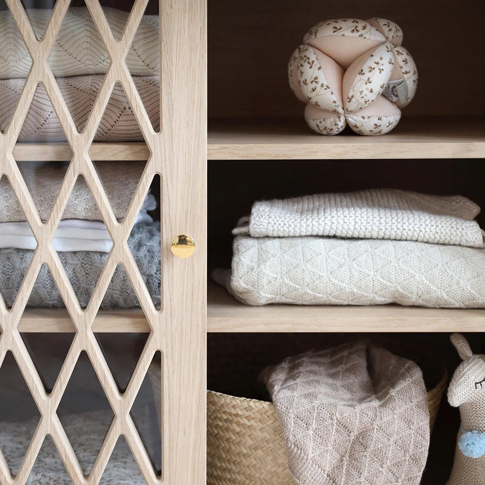 Die Türen des Wickeltisches mit dem charakteristischen Harlekin-Muster von Cam Cam und eleganten Messingknöpfen verfügen über eine praktische Soft-Close-Funktion und Plexiglas auf der Rückseite, um Staub fernzuhalten.