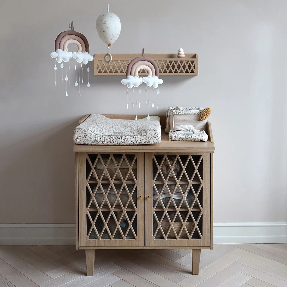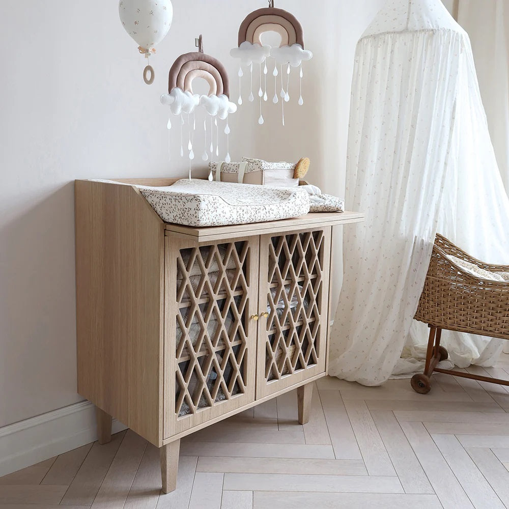 Der exklusive Wickeltisch aus Eiche von Cam Cam Copenhagen ist mit seinen warmen Holztönen in Kombination mit dem klassischen Harlekin-Muster eine zeitlose und schöne Ergänzung für jedes Zuhause.