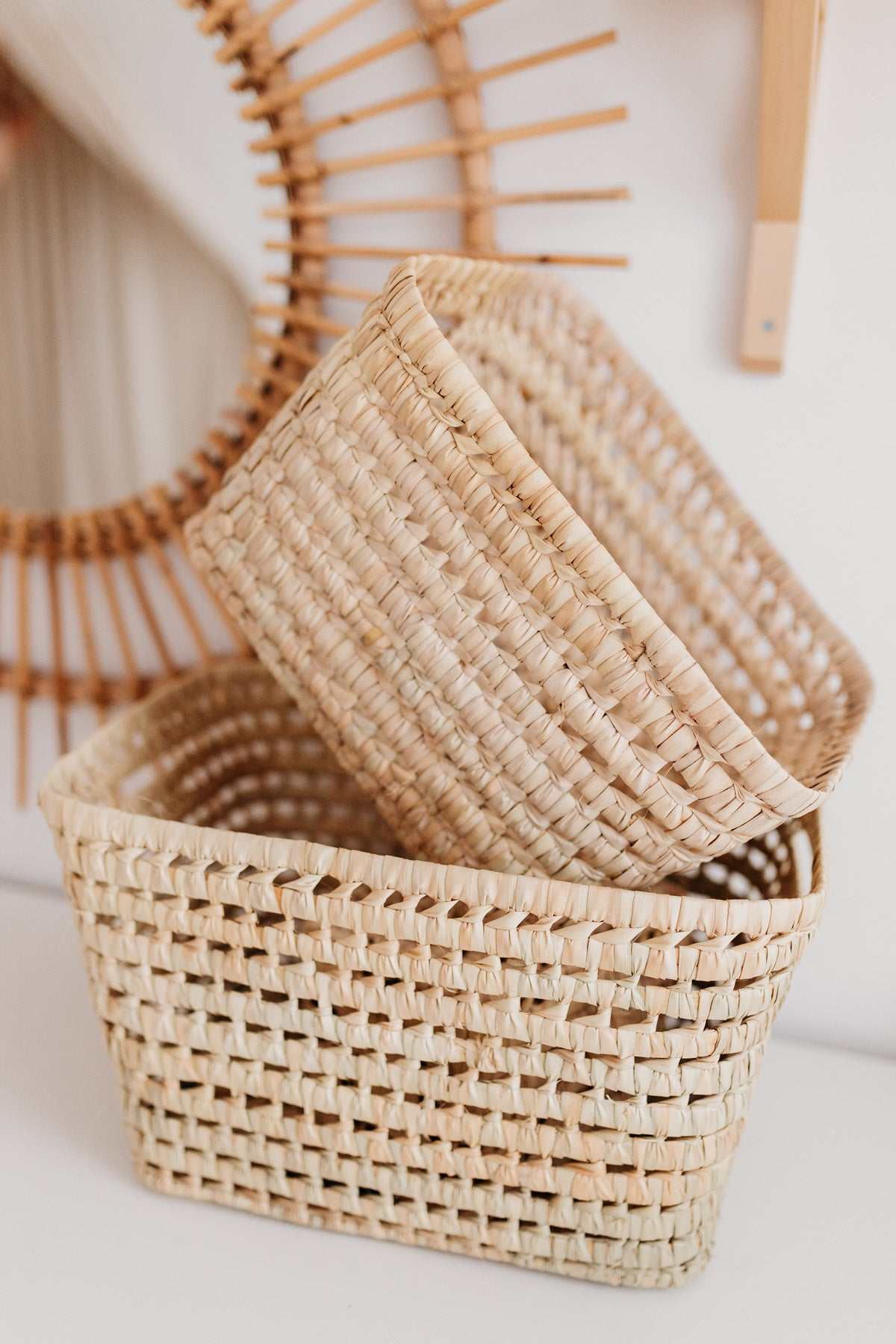 Die handgefertigten quadratischen kikadu Körbe aus Palmblättern sind praktische und dekorative Organizer für dein Zuhause oder das Kinderzimmer.