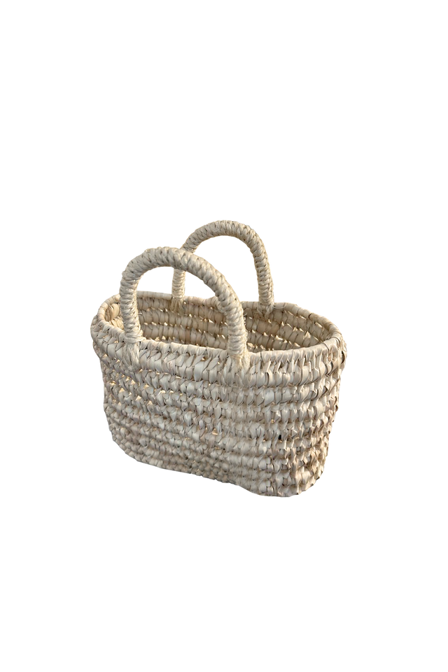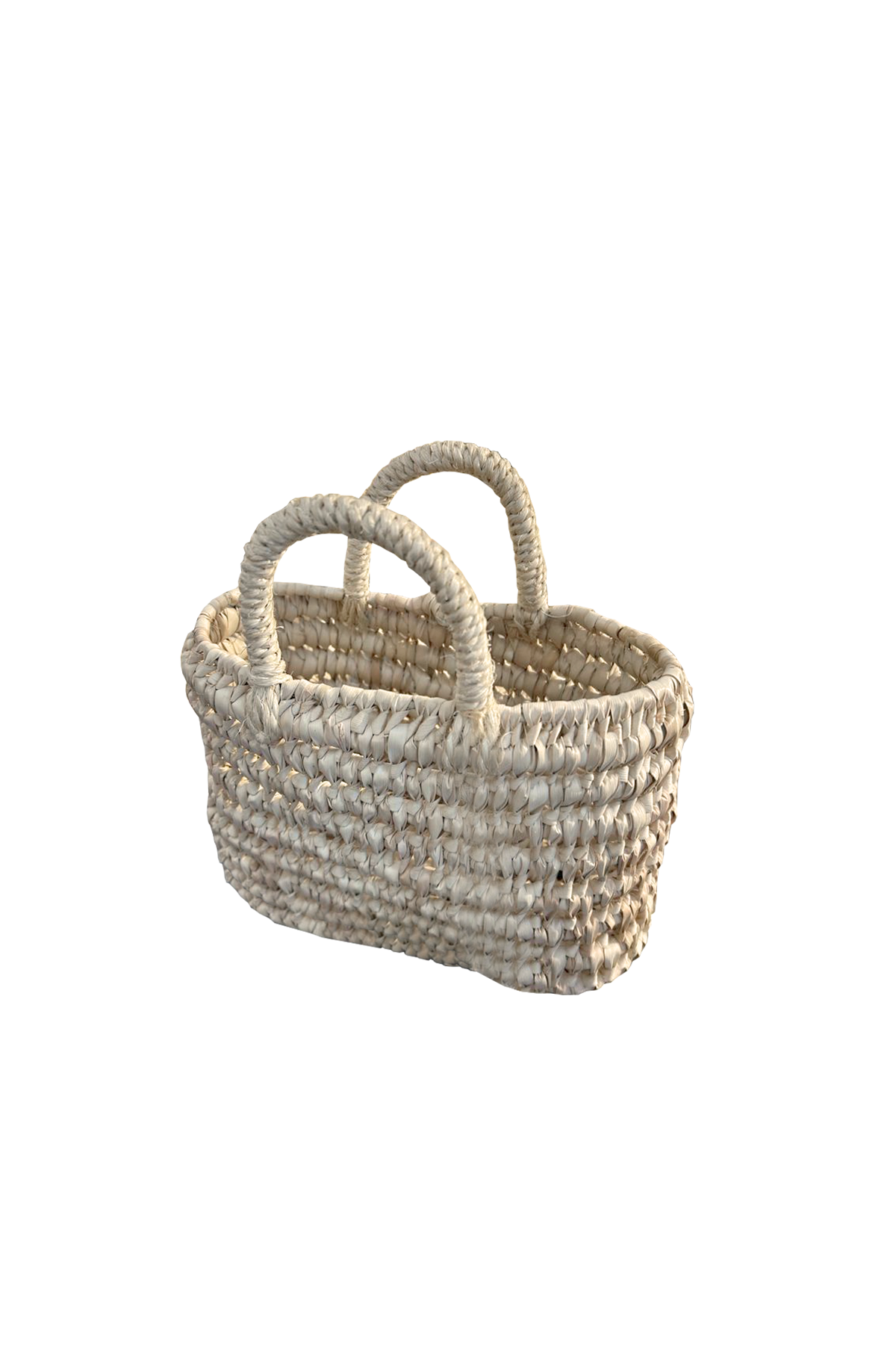 Der handgeflochtene kleine Shopper aus Palmenblatt ist ein charmantes Accessoire, das speziell für spielende Kinder entworfen wurde.