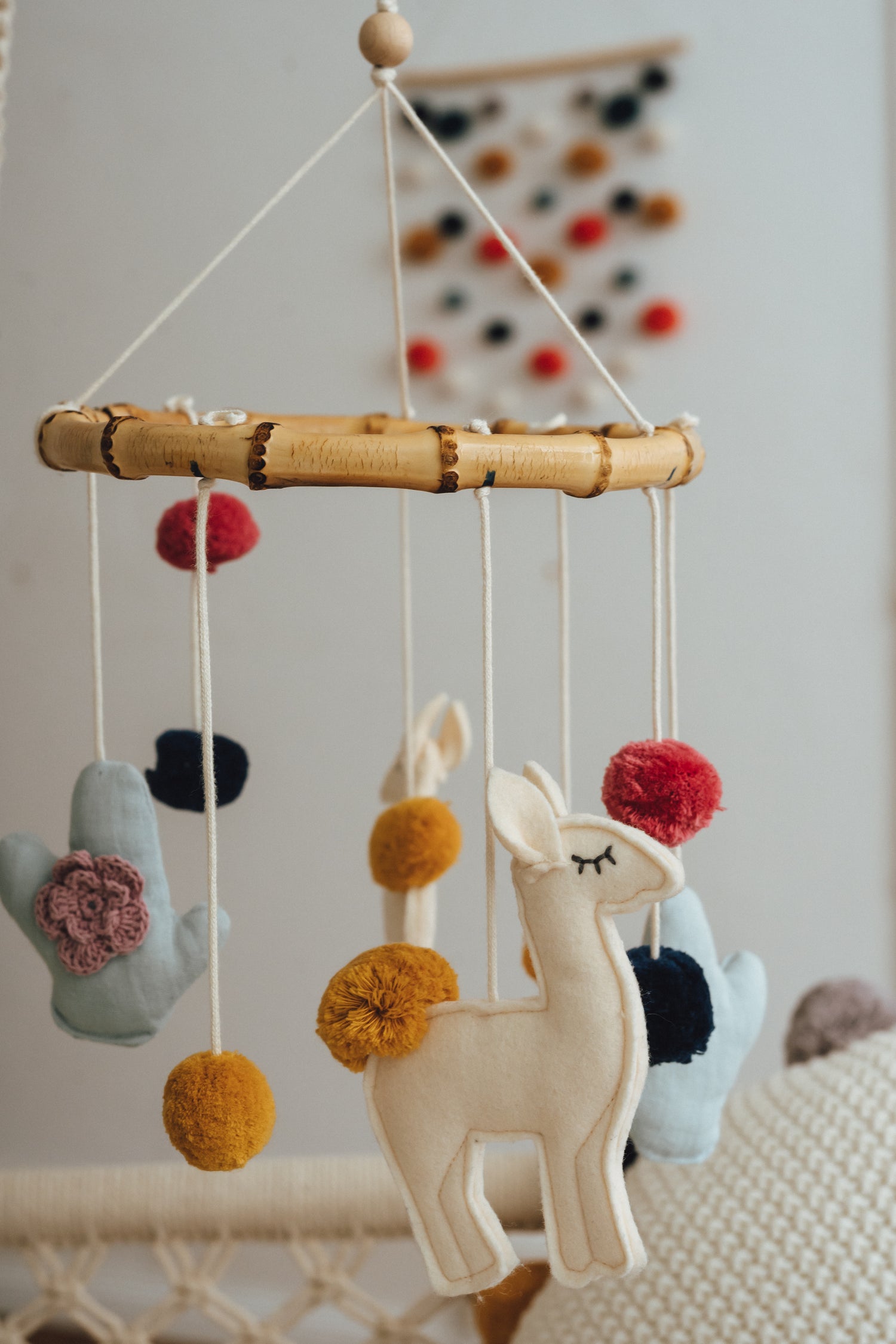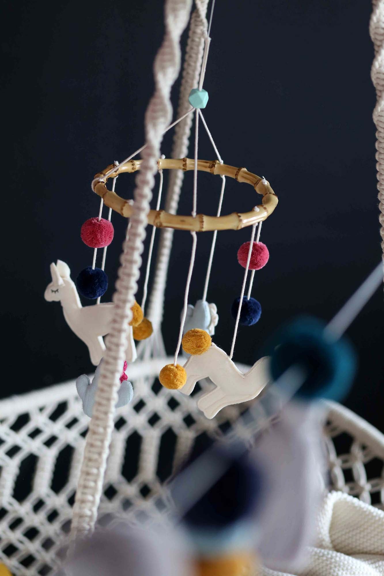 Unser Lama Mobile mit Holzring von Kikadu, passt durch sein natürliches Design mit verspielten und bunten Details aus ökologischen Materialien perfekt in jedes Kinderzimmer. Über dem Kinderbettchen für süße Träume oder dem Wickeltisch als Unterhaltung bereitet es den Kleinen mit seinen leichten Bewegungen viel Freude.