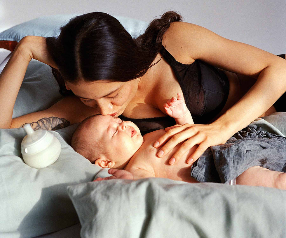 Im Bett liegend, auf dem Bauch – so, wie es euch und eurem Baby am liebsten ist, um Herzverbindung, Oxytocin und volle Intimität für alle zu fördern.