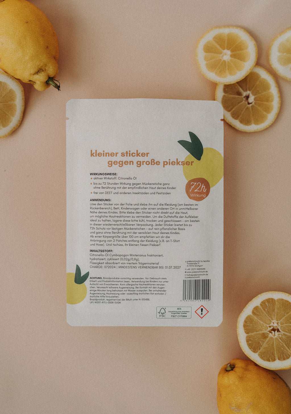 Rein pflanzlicher Mückenschutz für Babys und Kleinkinder ganz ohne Berührung mit der sensiblen Haut deines Kindes. Das geht doch gar nicht? Dann probier doch mal die niedlichen Anti-Mücken-Sticker von pieksmichnicht aus. Sie sind rein pflanzlich, frei von DEET und werden ganz einfach an der Kleidung deines Kindes angebracht. Einmal aufgeklebt, halten die kleinen Beschützer bis zu 72 Stunden effektiv Stechmücken ab und schützen dein Kind so vor fiesen juckenden Stichen. Gern kannst du den Sticker auch am Babybettchen oder Kinderwagen befestigen. Eine Verpackung enthält 24 Sticker. Für einen unbeschwerten Sommer in der Natur - natürlich ohne Stiche!