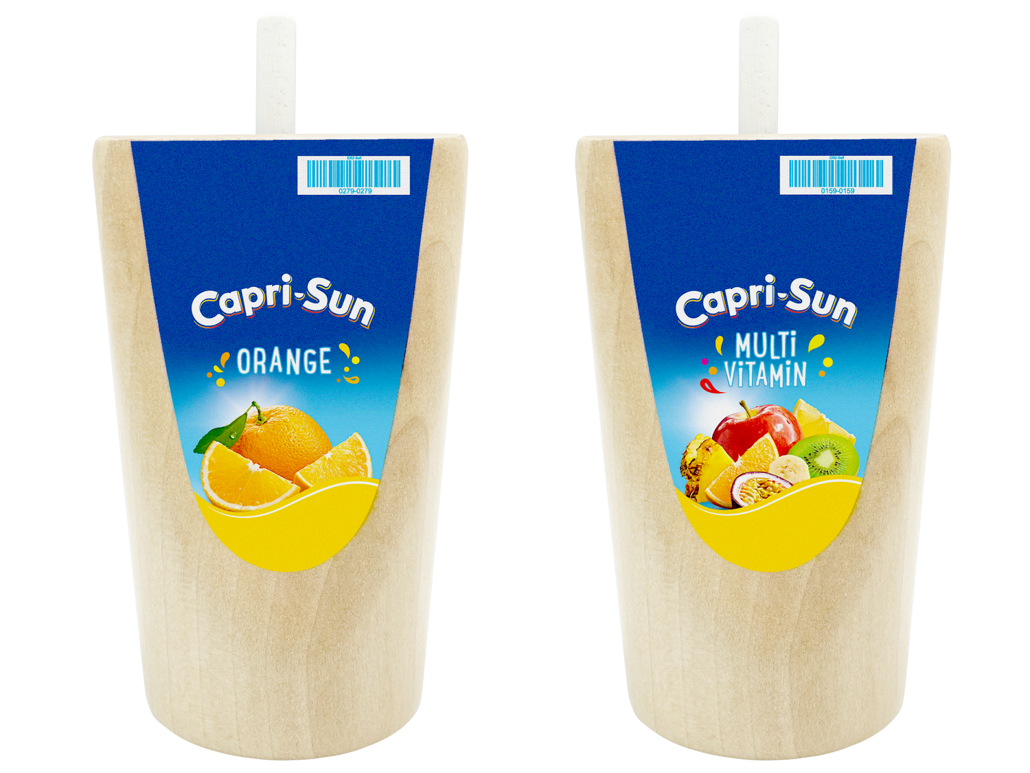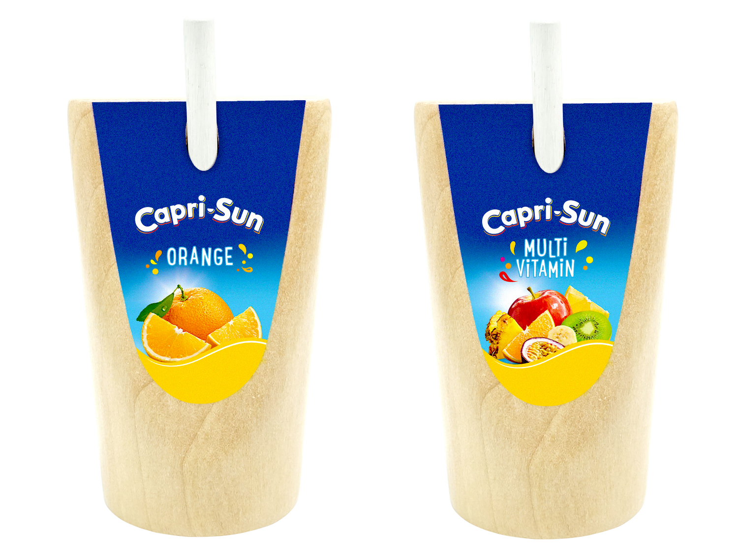 Mit diesen liebevoll gestalteten Capri-Sun Packungen aus Holz kommt echtes Sommer-Feeling ins Kinderzimmer. Das Set enthält zwei originalgetreue Miniaturen der beliebten Sorten Multivitamin und Orange – inklusive herausnehmbarem Holz-Strohhalm zum Einstecken, Spielen und „Trinken“.