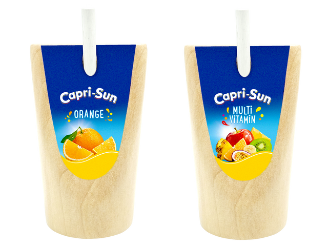 Inhalt: 1 x Capri-Sun Multivitamin (Holz), 1 x Capri-Sun Orange (Holz), 2 herausnehmbare Holz-Strohhalme