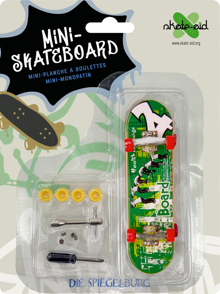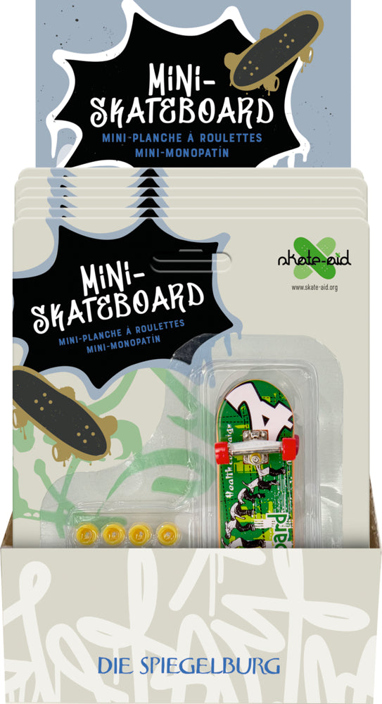 Entdecke das coole Mini-Skateboard von Die Spiegelburg! Dieses detailgetreue Finger-Skateboard bringt abgefahrene Skate-Action direkt in deine Hand. Mit einer Größe von ca. 9,5 x 2 x 2,5 cm passt es perfekt in die Tasche und sorgt unterwegs für jede Menge Spielspaß. Das Set enthält alles, was kleine Skater brauchen, inklusive 4 Ersatzrollen, 4 Schrauben, einem Schraubenzieher und Mutterschlüssel – für spannende Reparaturen und individuelle Anpassungen. Ein ideales Geschenk für echte Skater und Freunde von skate-aid! Verarbeitung: aus Kunststoff Altersempfehlung: ab 6 Jahren Maße: Mini-Skateboard: ca. 9,5 x 2 x 2,5 cm Warnhinweis: Achtung! Nicht für Kinder unter 36 Monaten geeignet. Erstickungsgefahr durch Kleinteile.