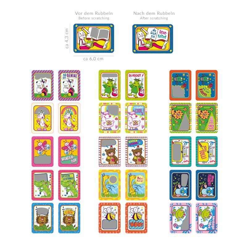 Das Set besteht aus 16 verschiedenen Motiven, die jeweils 9 einzelne Motivationskärtchen im Format 4,3 x 6,0 cm enthalten. Die Kärtchen sind zunächst versteckt, sodass die Kinder sie freirubbeln können, um die Motivationsbotschaften zu entdecken. Dies weckt die Neugier der Kinder und fördert den Spaß und Ehrgeiz, weitere Kärtchen zu erhalten und zu sammeln.