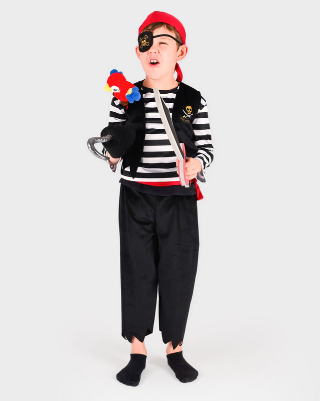 Der Papagei auf der Schulter und die Öse am Gürtel runden das Piratenoutfit ab und sorgen für ein stilechtes Erscheinungsbild. Die Hose ist bequem zu tragen und ermöglicht es Kindern, sich frei zu bewegen.