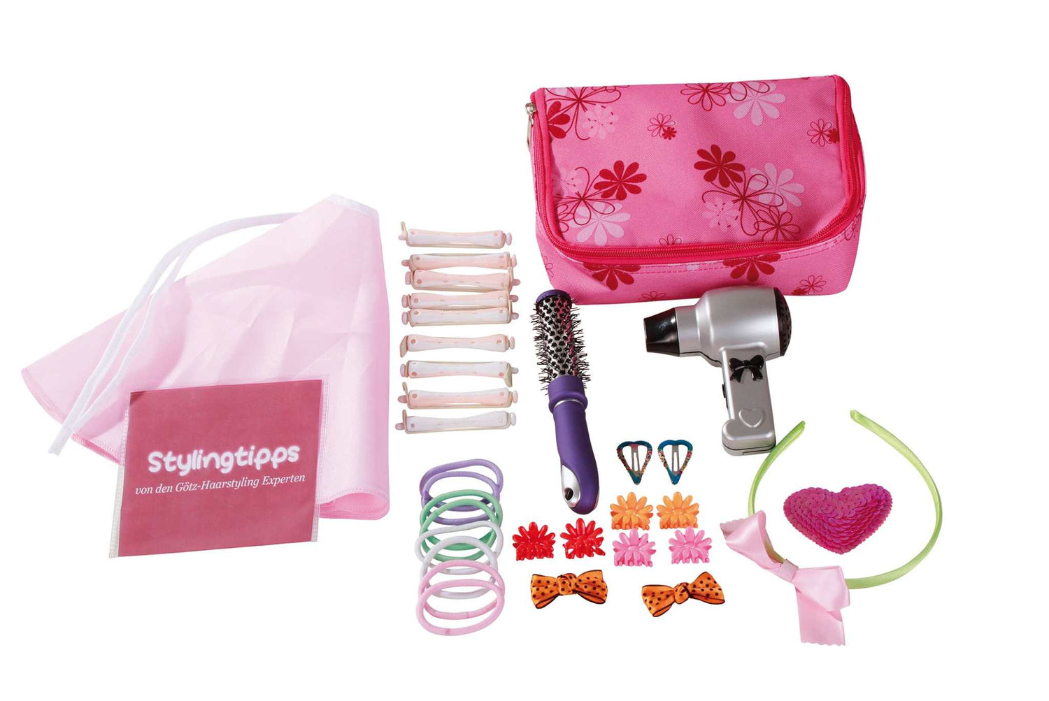 Das Set besteht aus: Tasche, 8 Haargummis, 10 Lockenwickler, 2 Klemmen in Herzform, Föhn, Haarreif, Lockenbürste, 2 Haarschleifen, Frisierumhang, 6 Klammern in Blumenform und Haarschmuck mit Pailetten.