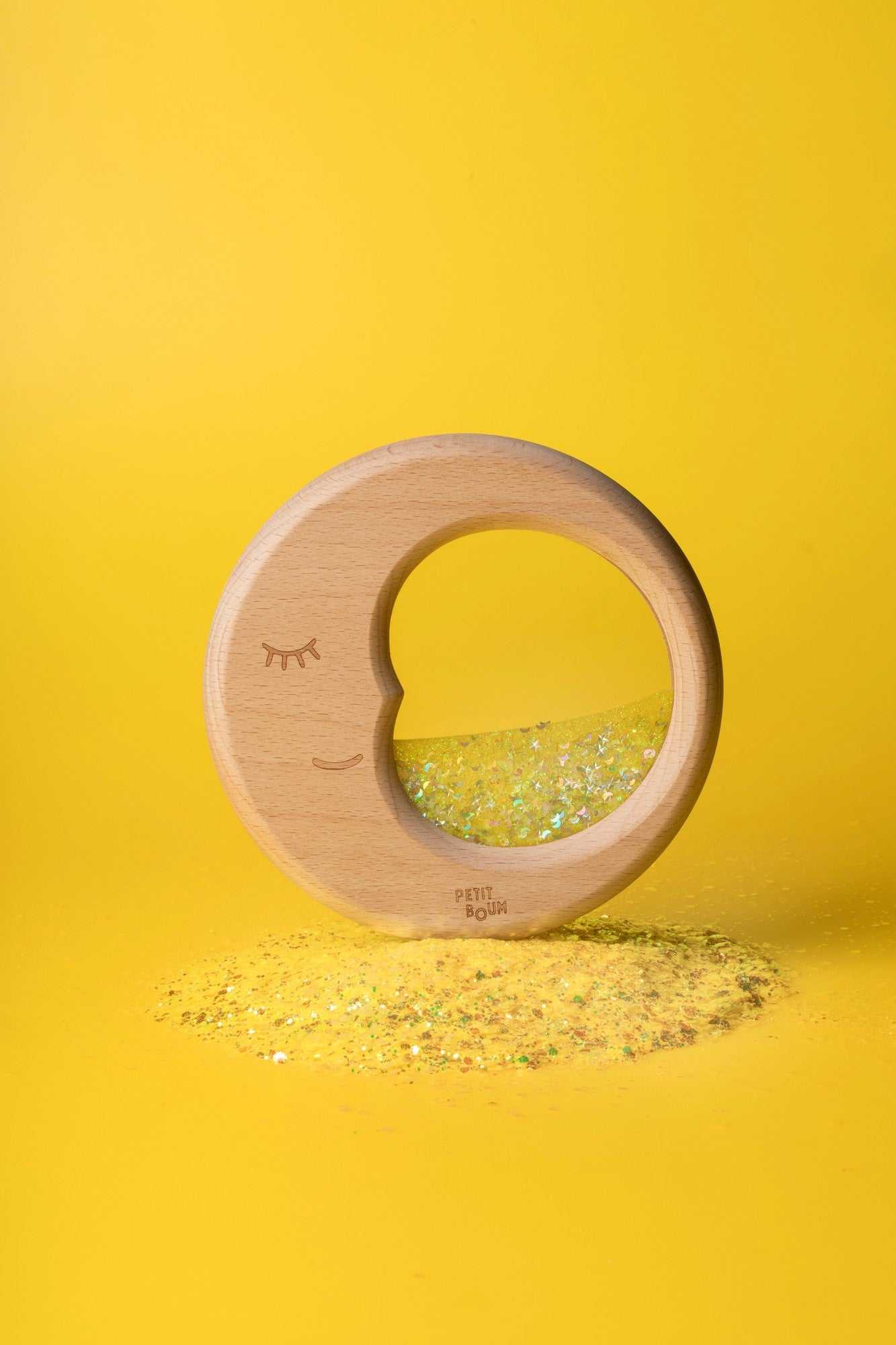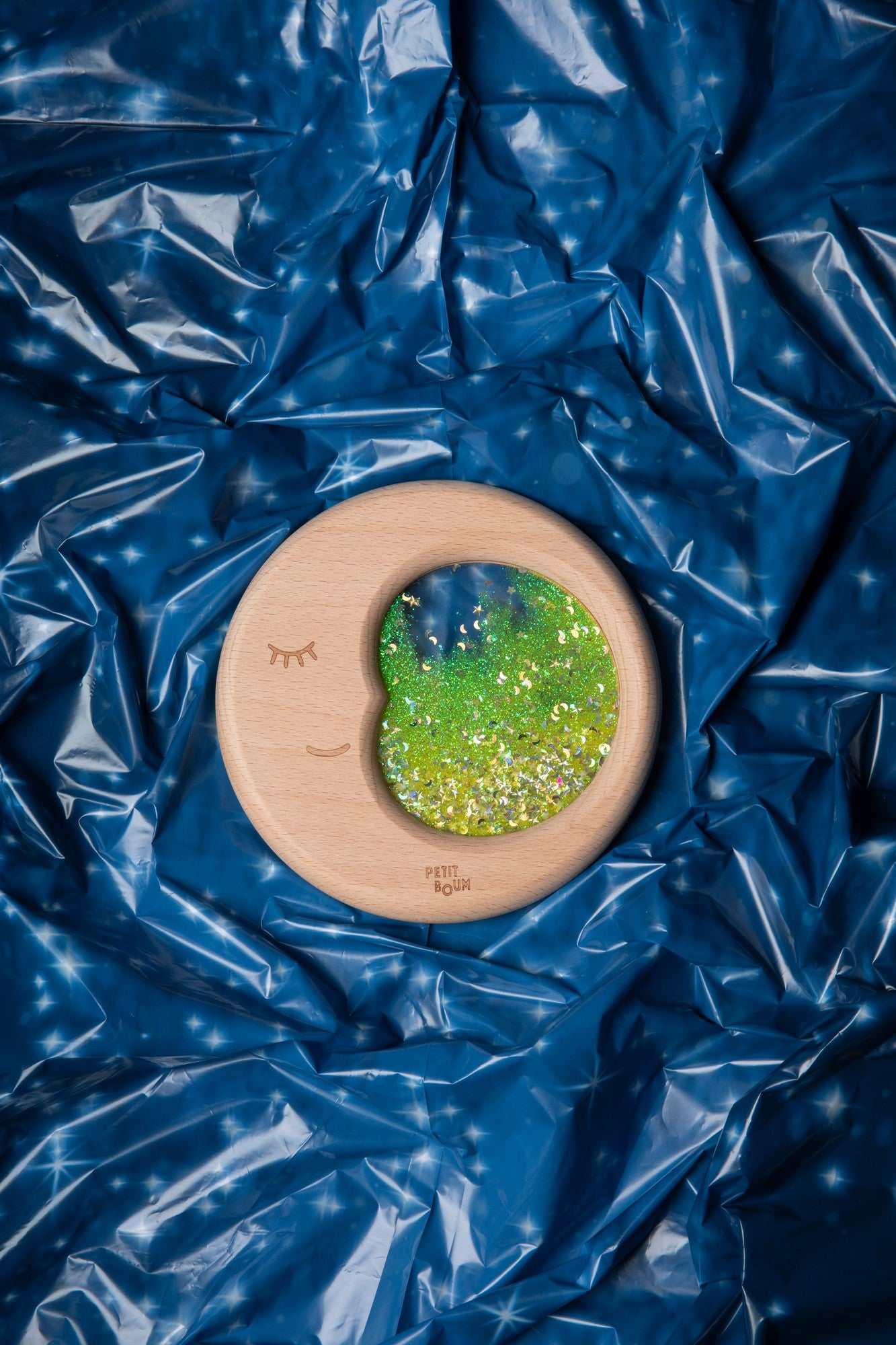 Hergestellt aus hochwertigem Buchenholz, ist der Sensory Moon mit agitierten Pigmenten gefüllt, die im Dunkeln leuchten und die Aufmerksamkeit der Kleinen auf sich ziehen.