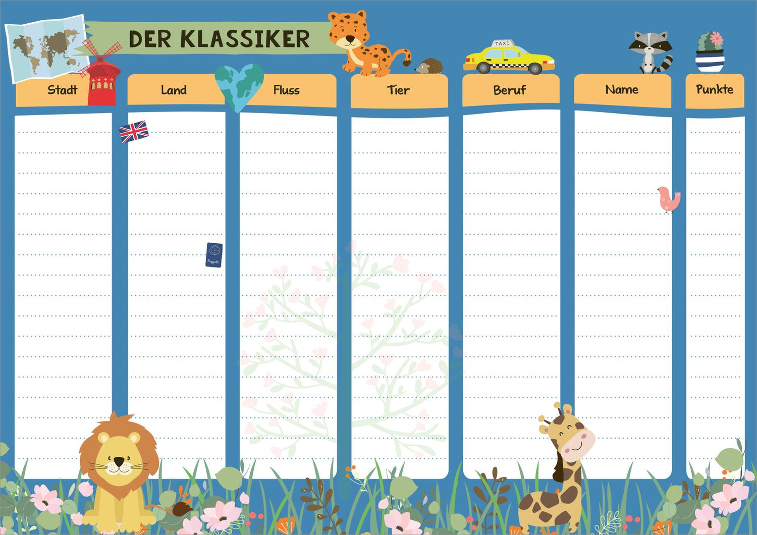 In diesem Ferienblock finden sich über 90 Vorlagen für den Spieleklassiker „Stadt, Land, Fluss“ – sowohl mit den klassischen Kategorien als auch mit ganz neuen, verrückten Rubriken! Es gibt 8 Spielvarianten mit zahlreichen Vorlagen, davon 3 speziell für die Ferien- und Urlaubszeit, sowie noch viele frei gestaltbare Seiten für die eigenen Ideen der Spieler und Spielerinnen. * Vielseitig einsetzbar: Ob mit 2 oder mehr Spielerinnen und Spielern, in der Familie oder mit Freunden und Freundinnen, für Jung und Alt – der Spieleklassiker zieht immer! * Spezielle Ausgabe für die Urlaubs- und Ferienzeit: Mit 3 Vorlagen, die besondere Kategorien für die Ferien bieten * Mit lustigen neuen Kategorien: Die Spieler und Spielerinnen können aus 8 verschiedenen Vorlagen wählen oder sich ihre ganz eigenen Kategorien ausdenken * Mit Anregungen und Listen für weitere Kategorien: Neben den Vorlagen gibt es eine lange Liste mit weiteren Ideen für neue Rubriken als Anregung für die Spielrunde * Ideal für Spieleabende in den Ferien: Der dicke Block bietet viel Spielspaß für lustige Runden * Super geeignet als Mitbringsel und kleines Geschenk für den Urlaub: Der Klassiker unter den Schreibspielen gefällt jedem! Für die ganze Familie! Sowohl als Familienspiel wie auch unter Freunden und Freundinnen ist das altbekannte Gesellschaftsspiel nach wie vor der Renner! Mit dieser liebevollen Gestaltung und den vielen lustigen Kategorien macht es noch mehr Spaß! Maße: 28,6 x 20,6 x 1,2 cm Altersempfehlung: ab 8 Jahren