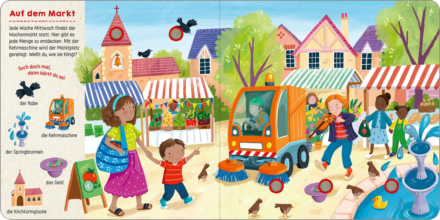 Auf insgesamt 5 Themenseiten haben sich die unterschiedlichsten Gegenstände der Kleinen versteckt. Von der Szene auf dem Marktplatz über den Kindergarten bis hin zum Badezimmer ist der Tagesablauf der Kleinsten abgebildet. Entdeckst du die Gegenstände vom Seitenrand in der bunten Szene wieder? Auf Knopfdruck werden diese zum Leben erweckt und bieten einen spannenden Sound. Ein perfekter Kleinkindbegleiter und zudem ein toller Start in die Bilderbuchwelt.