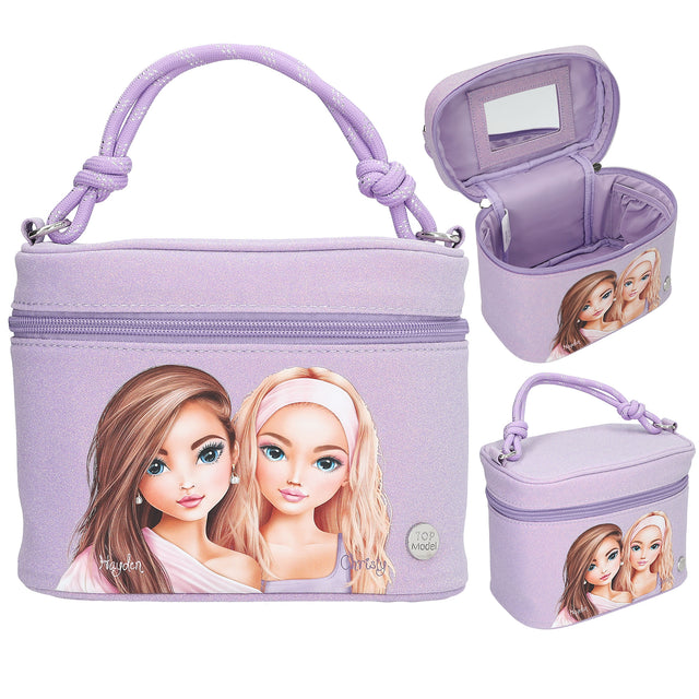 Glitzer, Glamour, genial! Der lilafarbene TOPModel-Kosmetikkoffer glitzert rundherum total edel. Mit großem Doppel-Modelmotiv auf der Front und einem Kordel-Tragegriff oben.