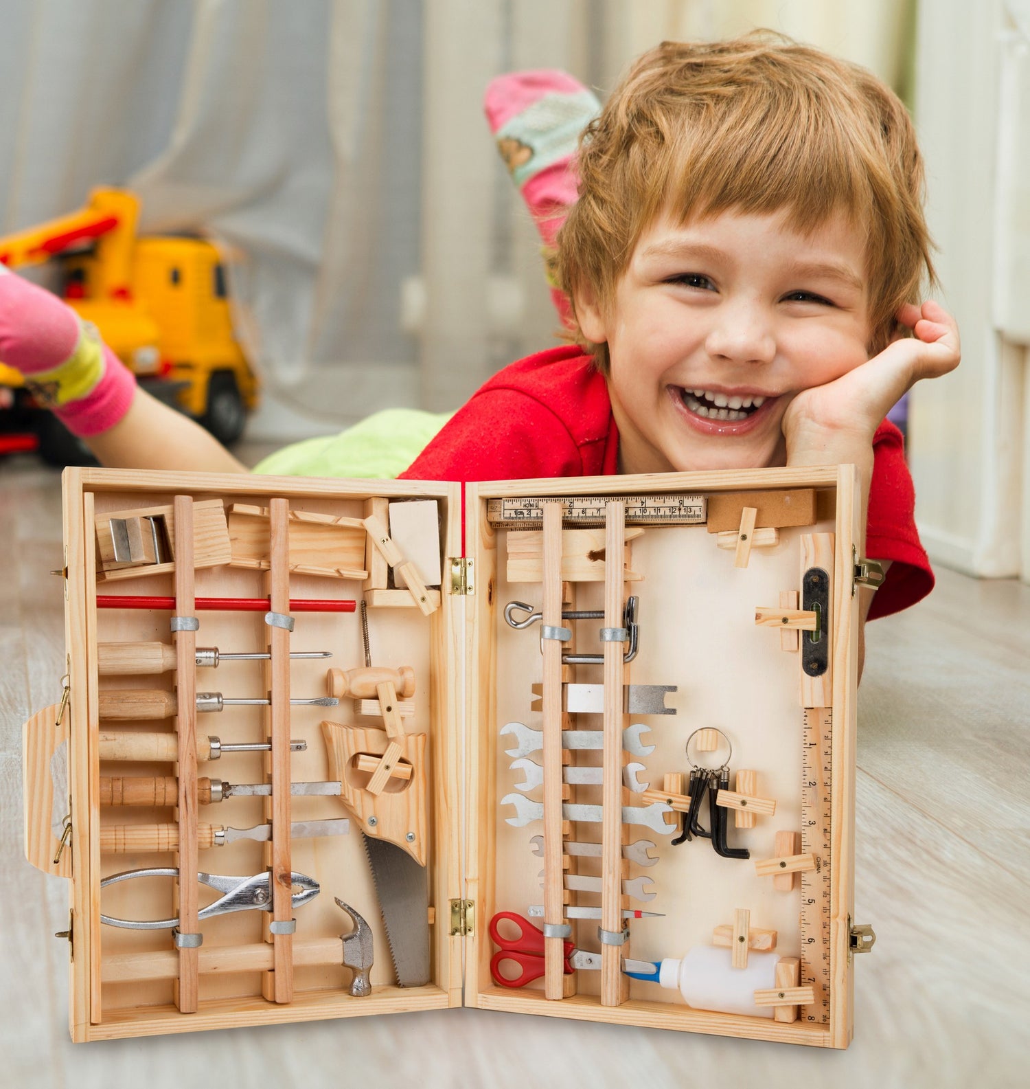 Dieser tolle Werkzeugkoffer von small foot, wird ihren kleinen Handwerker begeistern. Der klappbare Holzkoffer beinhaltet 48 Teile, da ist für jeden Auftrag das passende Werkzeug immer griffbereit. Alle Werkzeuge haben im Koffer einen festen Platz, dieser ist mit einer Sicherung versehen, damit beim Transport nichts durcheinandergeraten kann. Modell: Material: Holz/ Metall Abmessung: 37 x 29 x 8,5 cm Altersempfehlung: ab 6 Jahre Inhalt: 5 Schraubenschlüssel, 1 Lineal, 1 Zange, 1 Hammer, 1 Schere, 1 Pinzette, 1 Säge, 1 Wasserwaage, 1 Bleistift, 10 Steckschlüssel, 10 Schrauben, 2 Schraubenzieher, 1 Schmirgelpapier und vieles mehr.....