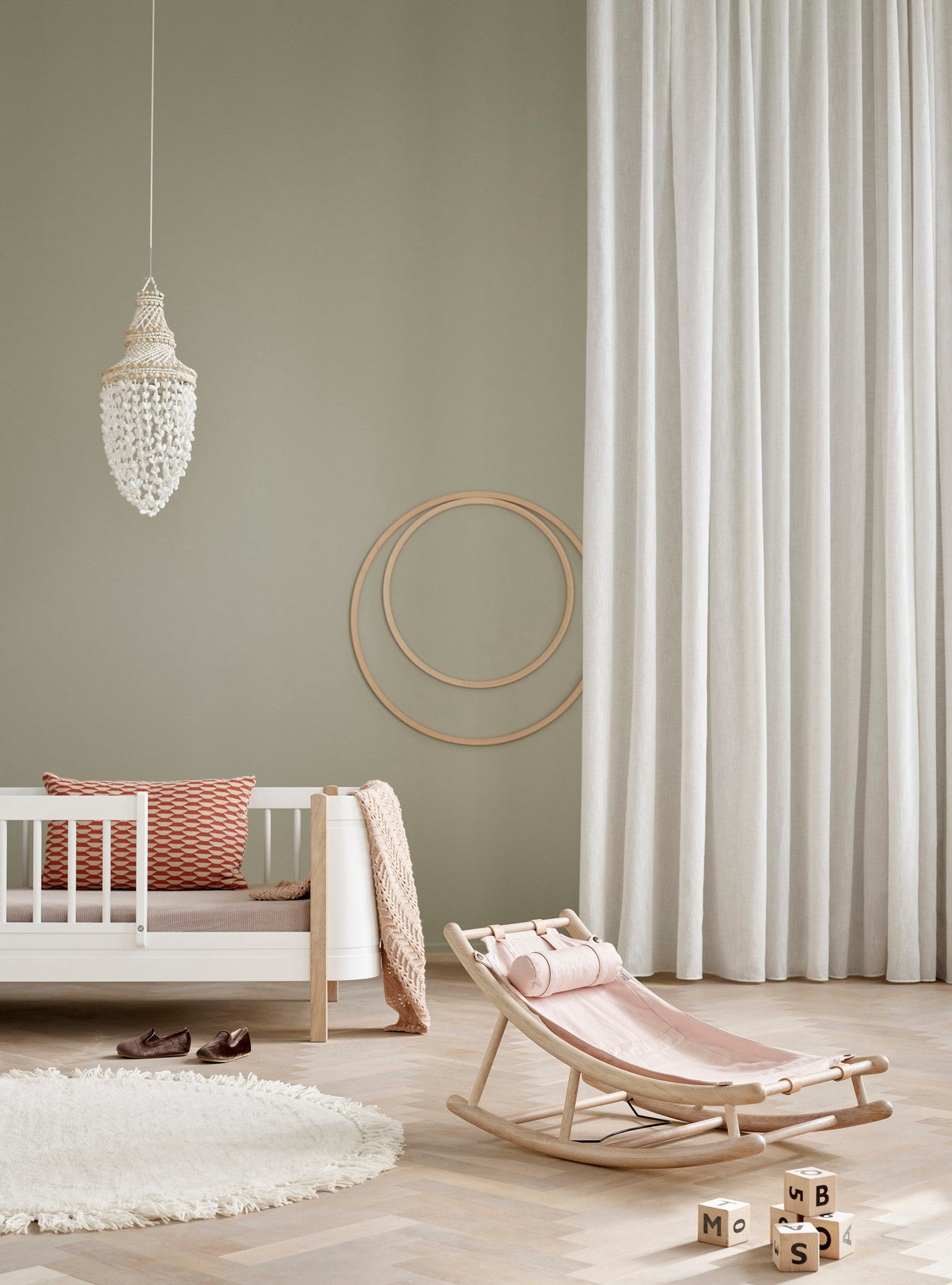 Der Rahmen ist aus massiver, weiß geölter Eiche hergestellt. Die Bezüge in schlichten Naturtönen verleihen der Wippe eine visuelle Leichtigkeit und passen somit zu jedem Einrichtung Stil.